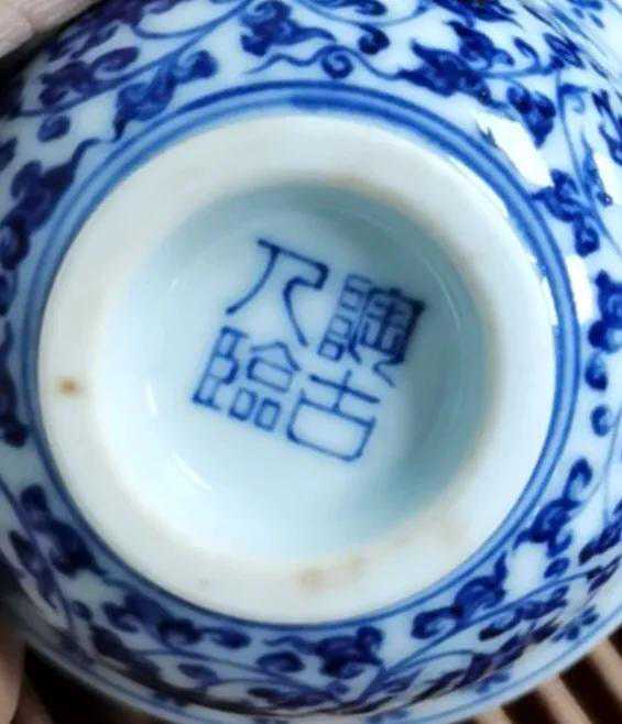 永乐压手杯的款识,蝇头小字,清晰可辨。在画面上的安排非常巧妙,款识与花纹融合在一起,不是单纯为了写款而写款,而是与瓷器装饰相结合,既告知器物的年代,又使人赏心悦目。狮子滚绣球是民间表示吉祥的一种舞蹈,以此为题材画在杯的内心,将“永乐年制”四字写在球内,这种巧妙的安排充分反映了景德镇陶瓷工匠们高雅的艺术修养。