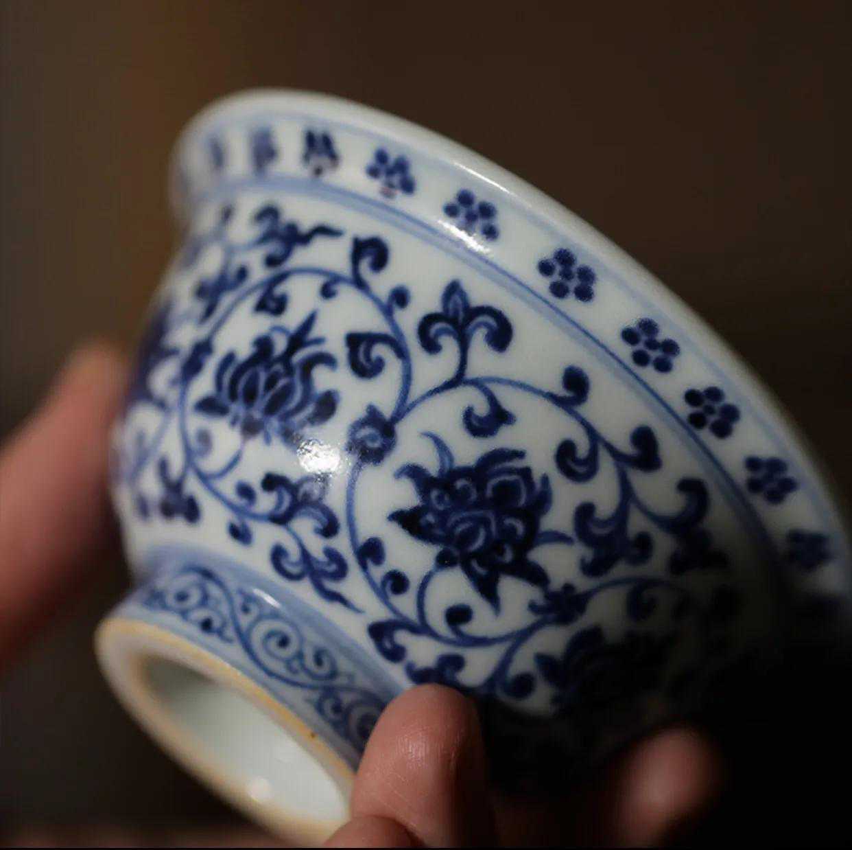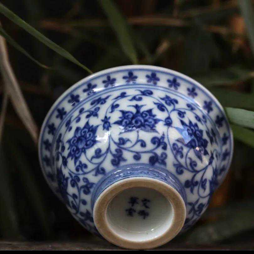 【明·永乐青花压手杯】是创烧于明朝永乐年间的官窑,其特点为胎体厚重,重心在杯的下部,口沿微微外撇,手握杯时,正压合于手的虎口处,给人以沉重压手之感,故有“压手杯”之称。是明代瓷器中能与文献记载相互印证的一种实物,具有重要的研究价值。