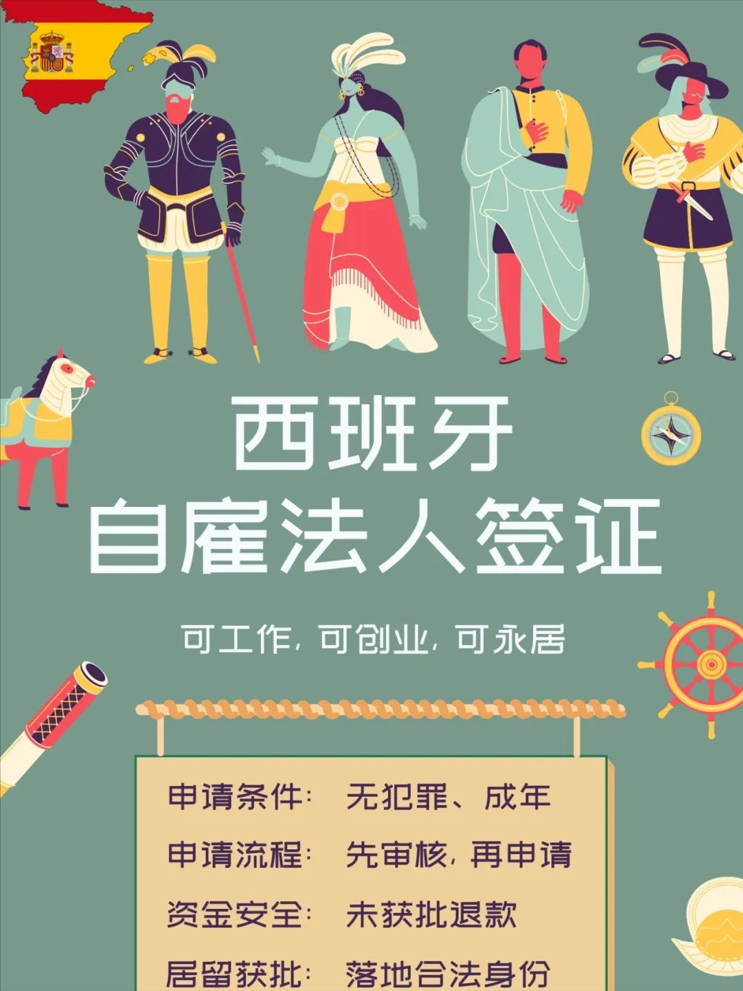 定义:根据法案规定,外国人在拥有足够资金和创业项目的条件下可申请西班牙自雇法人签证。时间自由不受限制,可打工、可开店、可永居