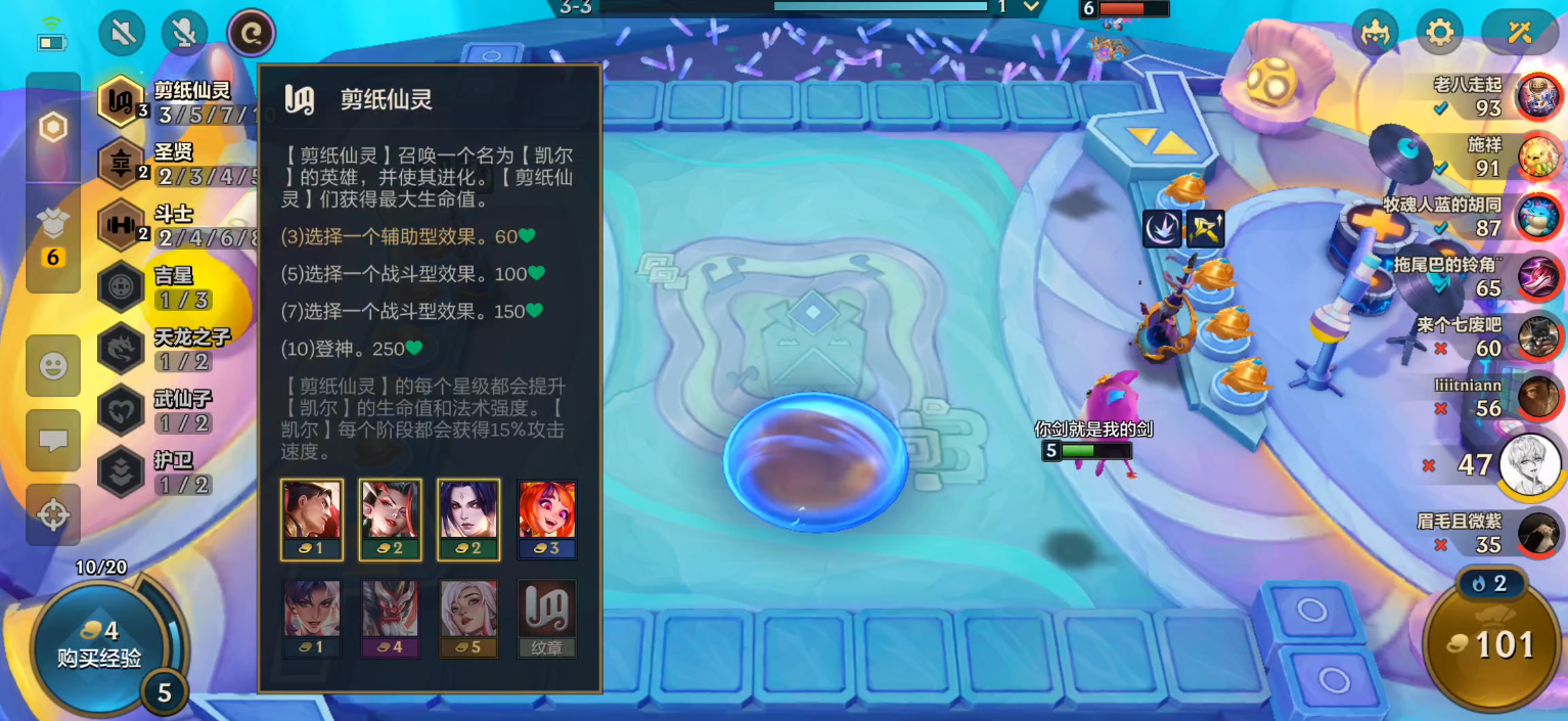 到了六人口,就可以刷一波了,刷到三费的佐伊,就能凑齐五剪纸仙灵,让凯尔多一个符文,杀伤力会大幅提升。然后可以小D一波,尽量拉一下阵容质量,只要两星,就可以拉人口等级了。