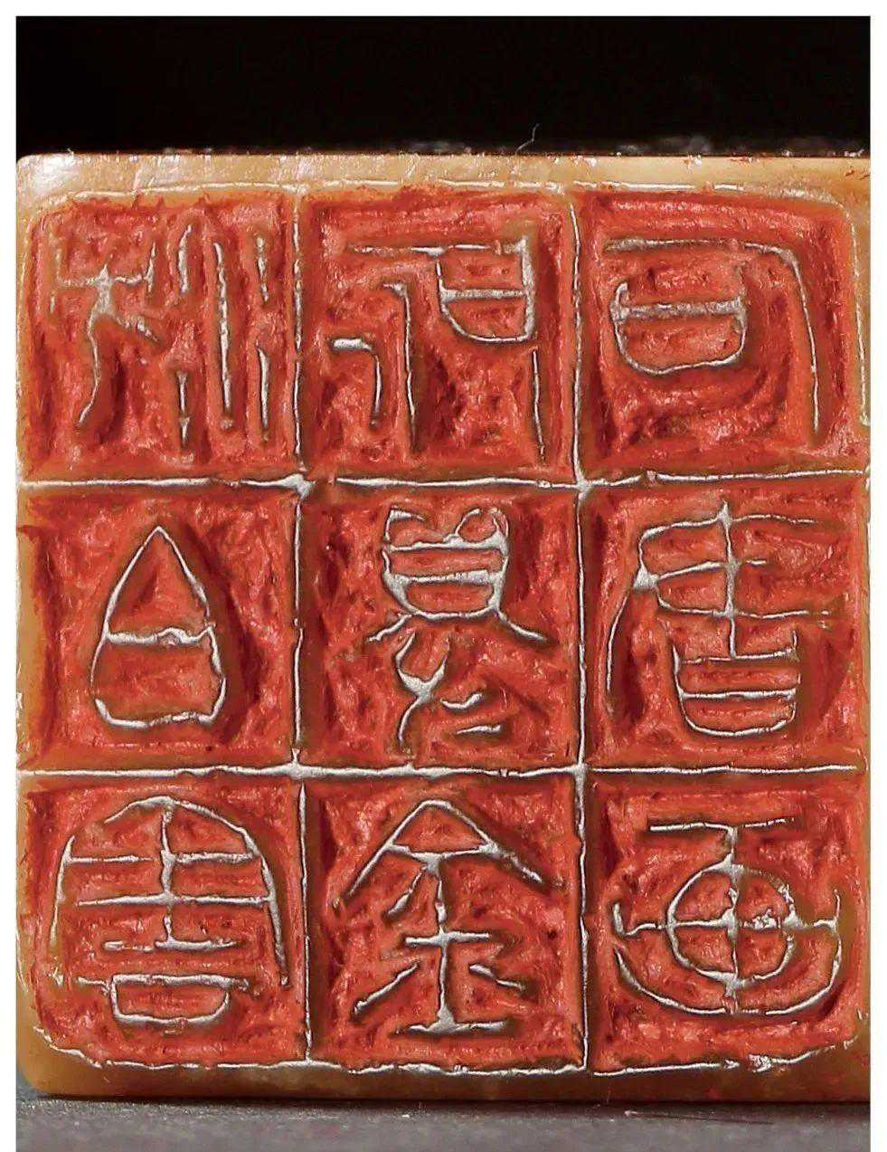 沈伯云所得金石书画甲申十有一月,伯云属刻九字印。昌石吴俊记。2.50cm×2.50cm青田石
