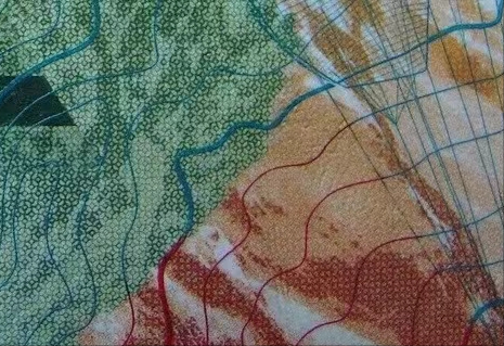 第三点:多色凹印接线,50背面大面积地图的等高线全部采用凹印完成,油墨的精确控制,印刷机械的精密程度,展现了瑞士的印刷功力。
