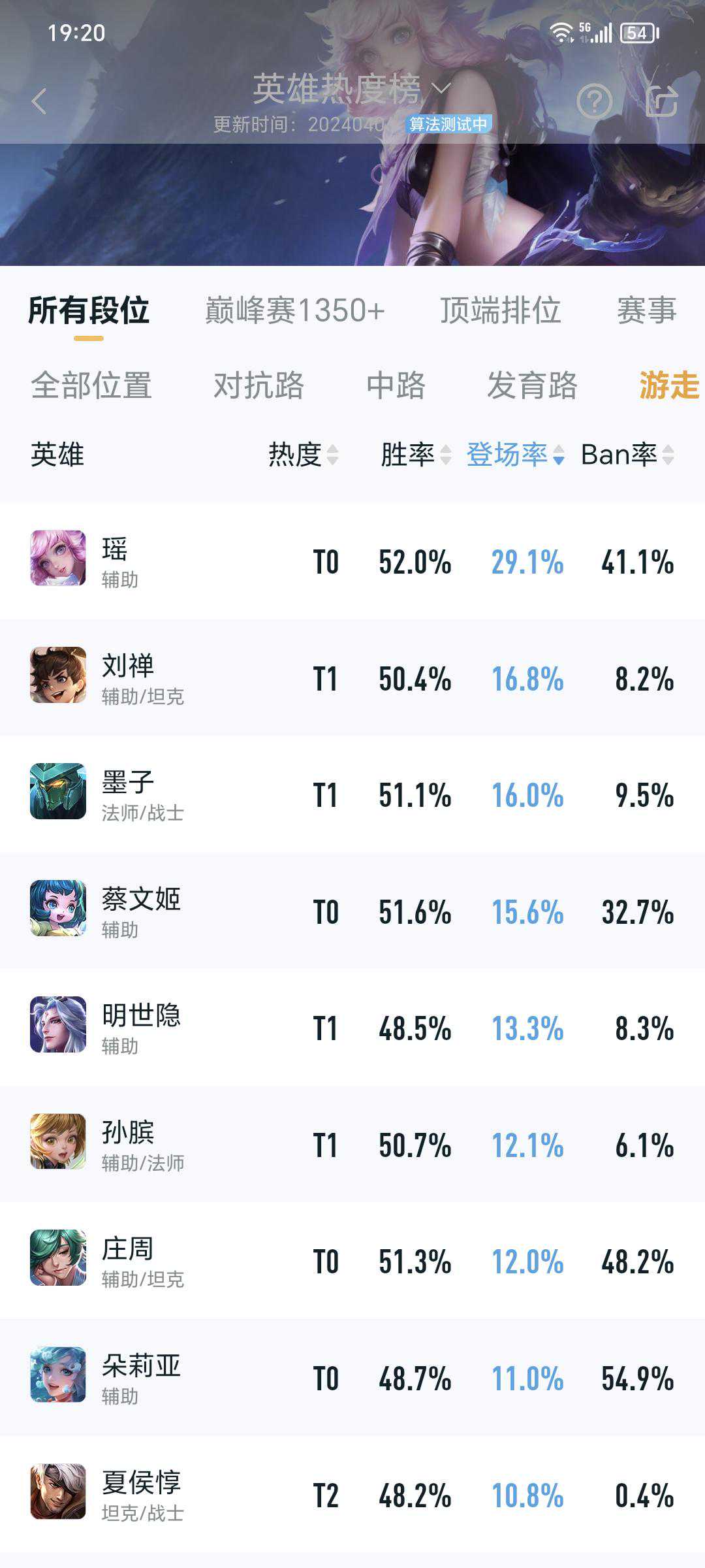 五:明世隐出场率13.3%胜率48.5%明世隐在软辅中的胜率率算是比较低的了,这个英雄同样能大幅提升射手的生存能力,但有很多英雄不太适合,过于灵活的英雄他有点跟不上。而瑶妹没有这个困扰,无论是谁,都可以坐在身上。