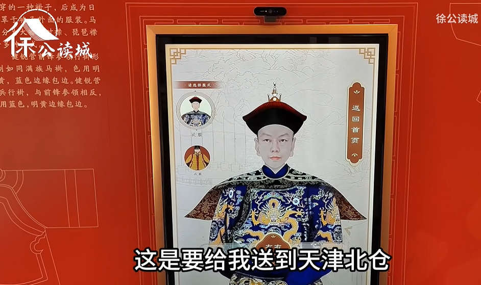 这间屋子里的内容,则是旗营文化展。里边有个互动屏,能看到自己穿清装的样子。这个成品效果简直丑爆了,就像是穿上了装裹一样,整个是一个老僵尸。这是要给我送到天津北仓,还是北京八宝山啊?