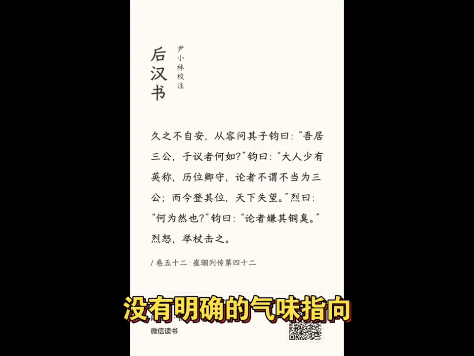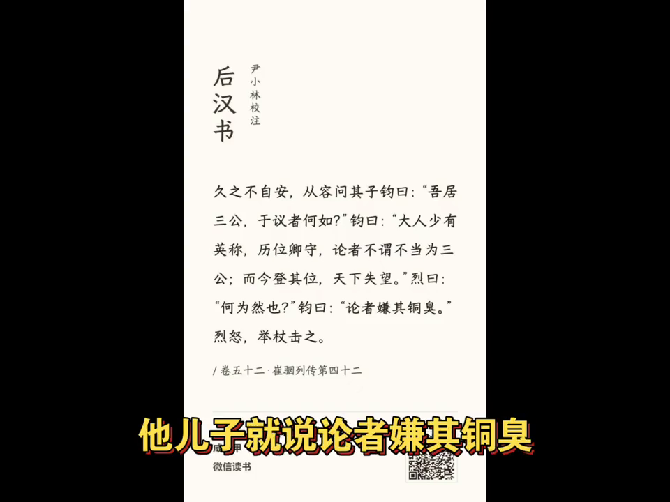 崔烈就问说这是为什么?他儿子就说论者嫌其铜臭,因为大家觉得您现在三公有一种铜臭味,主张读秀的人认为这里的铜臭指的是铜钱的气息,没有明确的气味指向这个词的负面色彩,只是由这则典故带出来的,这种事很难掰扯清。