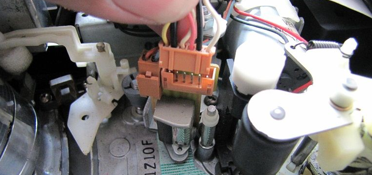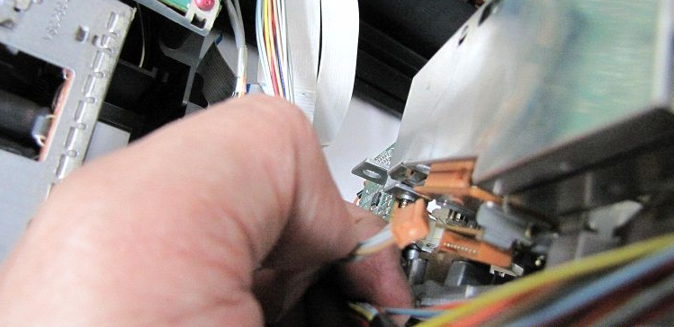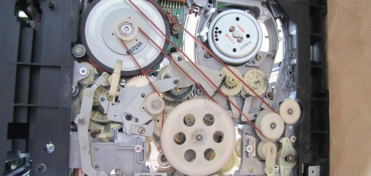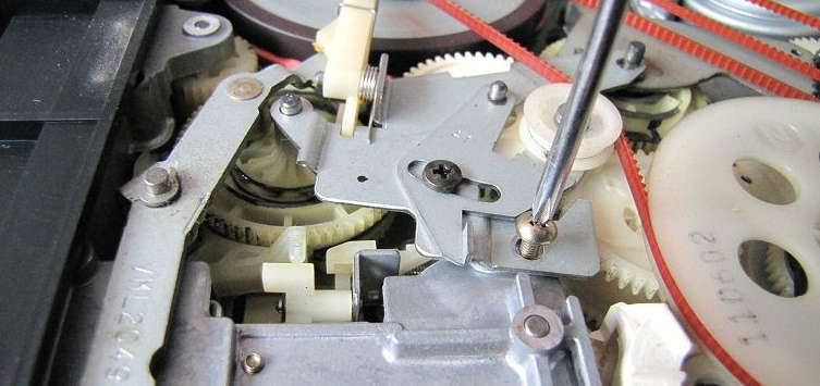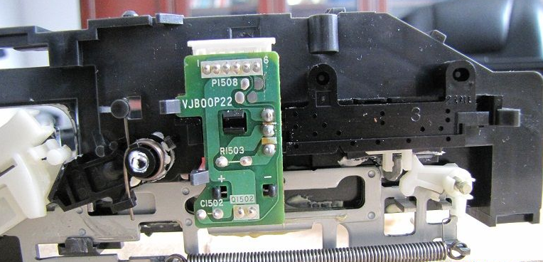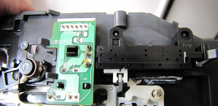 松下G型机芯的带仓传感器和机芯的状态开关是在CPU的预设程序下协调配合完成系统控制,卸下前面板,再卸下VR电路板,卸掉两个固定机芯的金属螺纹螺丝和机芯后中的一个自攻丝螺丝,掰松带仓传感电路板(6针)锁扣,分别松开其6线(4线往主板、2线带仓带尾光敏管的连线)。卸下带仓上盖板两个螺丝,并卸下带仓上盖板,取下带仓。