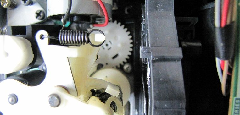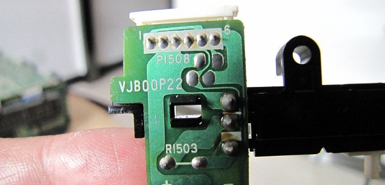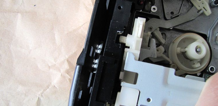 再卸掉带仓总成的4个红色金属螺纹螺丝,取下带仓总成,掰住三个卡扣,即可卸下带仓传感开关,把其电路板上的三个焊点焊开,取下带仓传感开关,轻轻撬开其周围三个卡扣,撬开带仓传感开关可见其内部铜黑氧化比较严重(分别按拆卸顺序放于一旁,螺丝分类按拆卸顺序放好)。