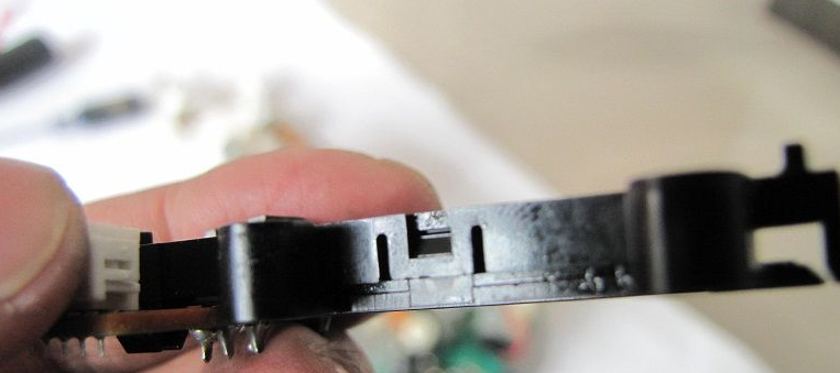 卸下倒带电机同步皮带和固定其的三个螺丝,拔掉音控磁头上方插件使倒带电机总成与机芯本体脱开,再卸下压带轮组件,即可完全暴露方式选择开关,卸下其固定两个螺丝,再焊开状态开关的5个焊点,即可取下方式选择开关,捏住四个白色卡子即可卸开方式选择开关,可见其内部铜黑氧化也比较严重。以拆卸反方向把机器装回。