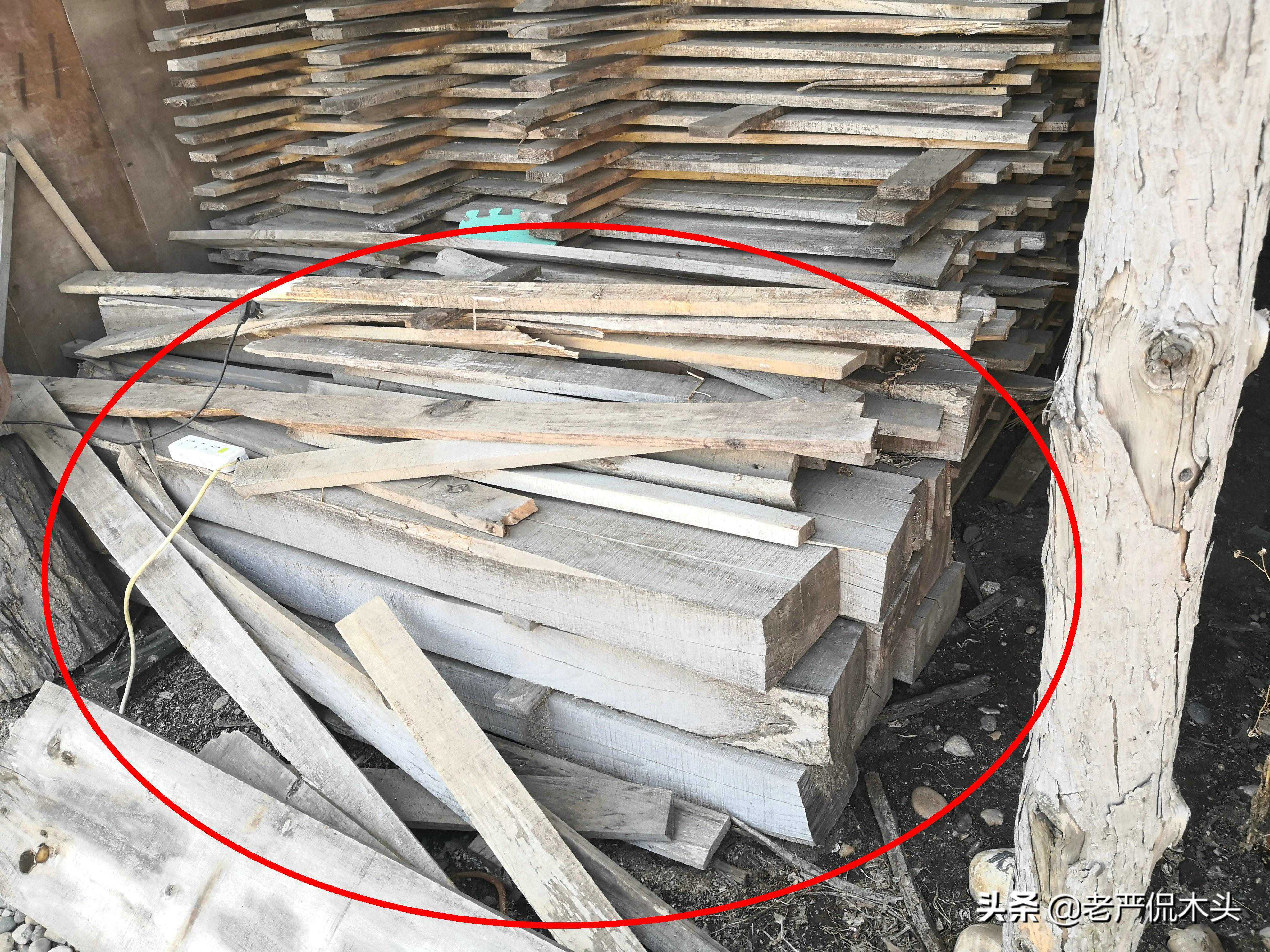 木材放久了基本都一个模样——灰扑扑的,看到的就这样,现场也没条件刮一下看看纹理,虽然都说这木头不错,但咱也不知道好在哪里。