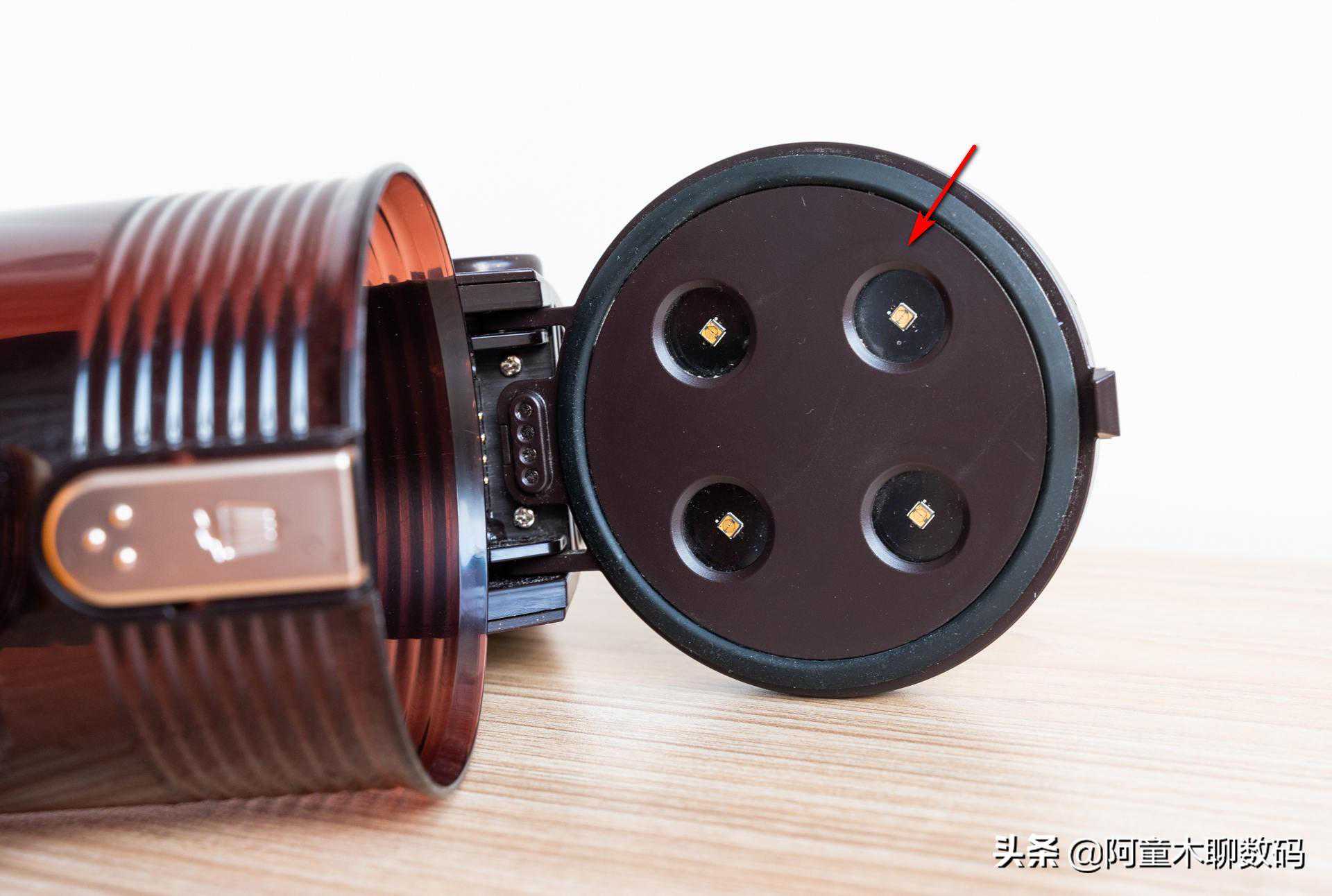 打开尘杯的底盖,可看到内部有四个大小相同的圆形UVLED灯,这就是具备Violeds杀毒技术的紫外线灯!相比一些其他品牌吸尘器的外置紫外线灯管,这种内置紫外线灯,可将细菌等病毒锁死在尘杯中,更加有效的消灭细菌。
