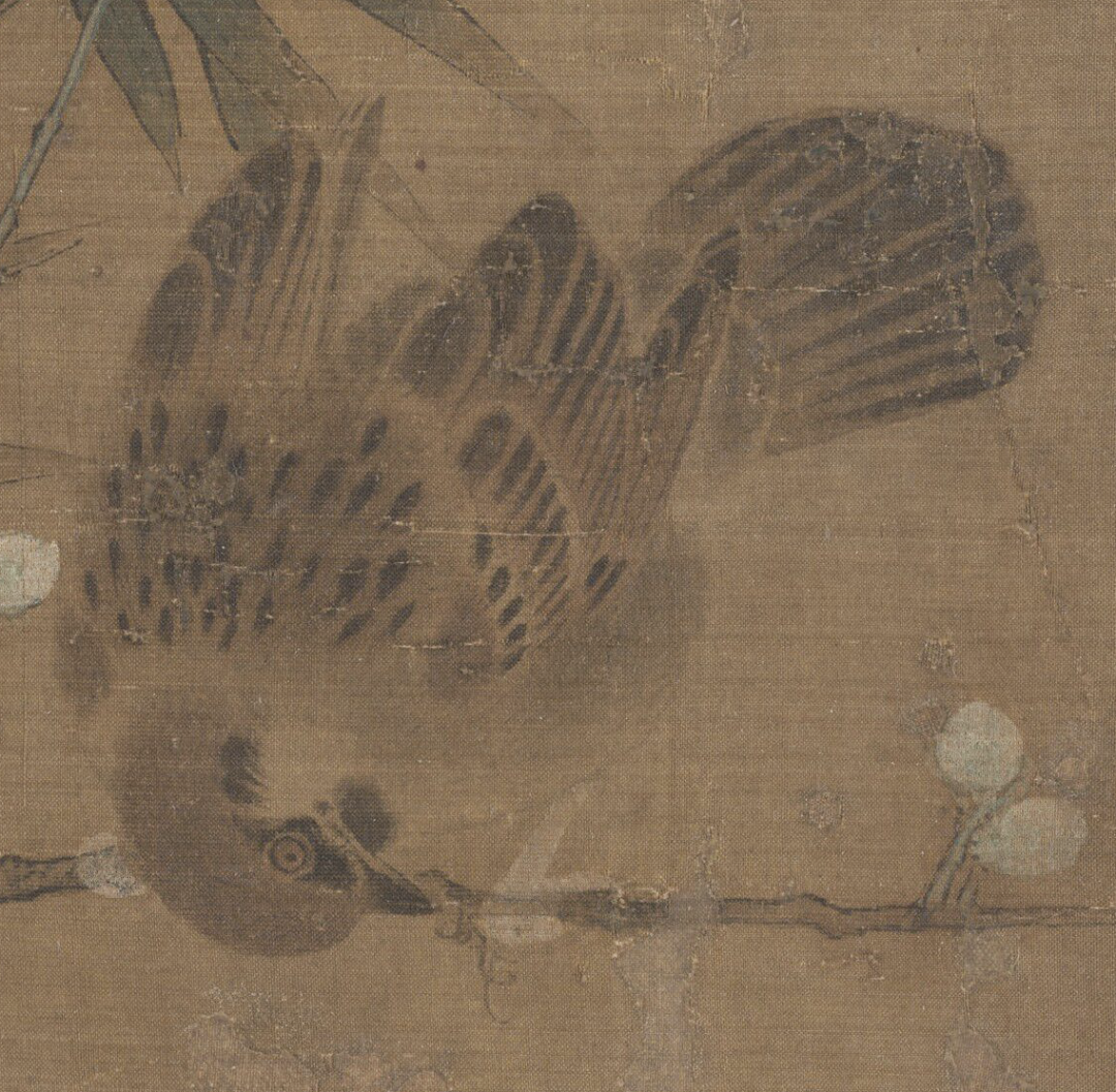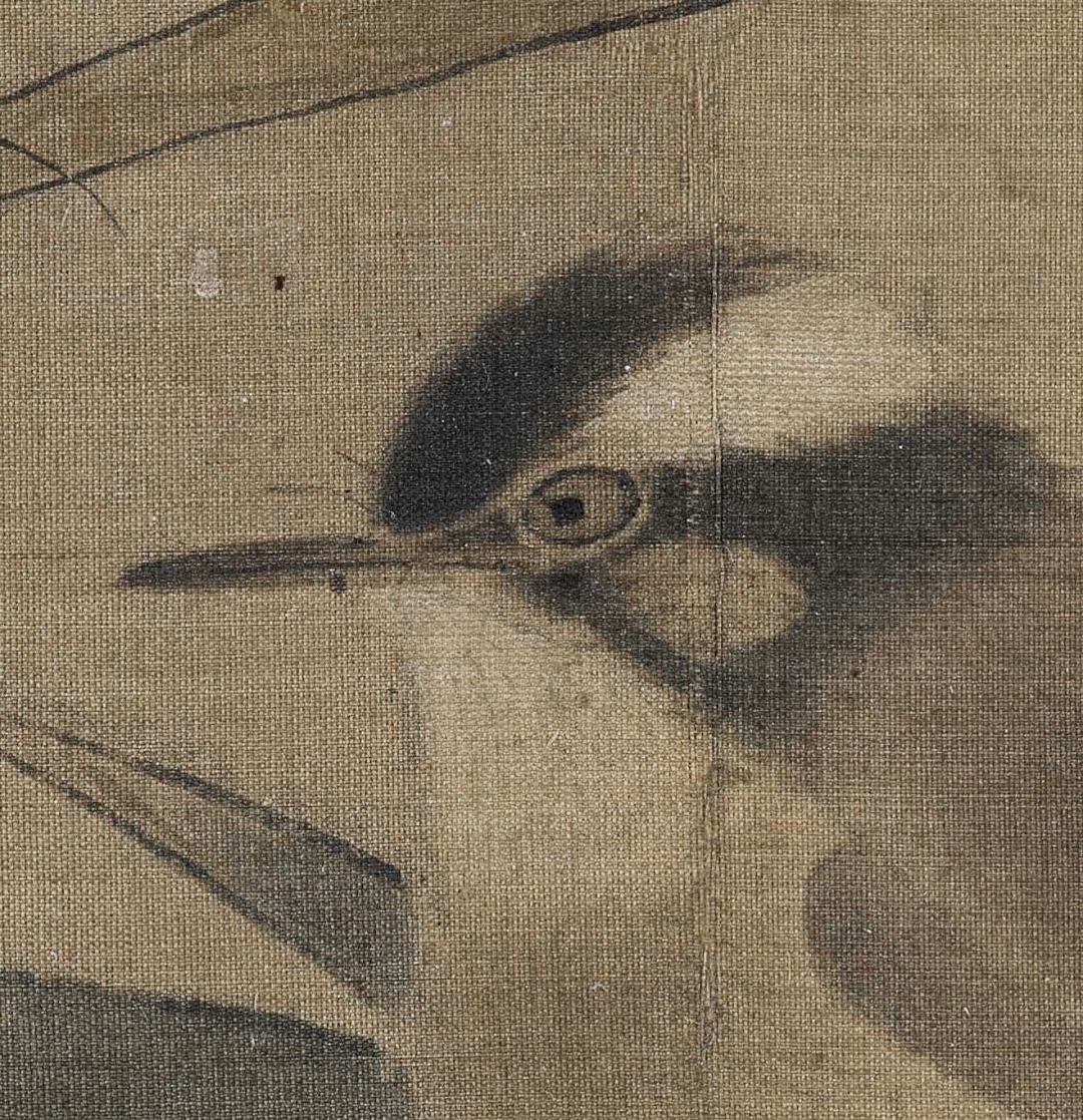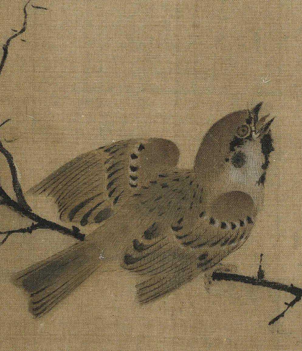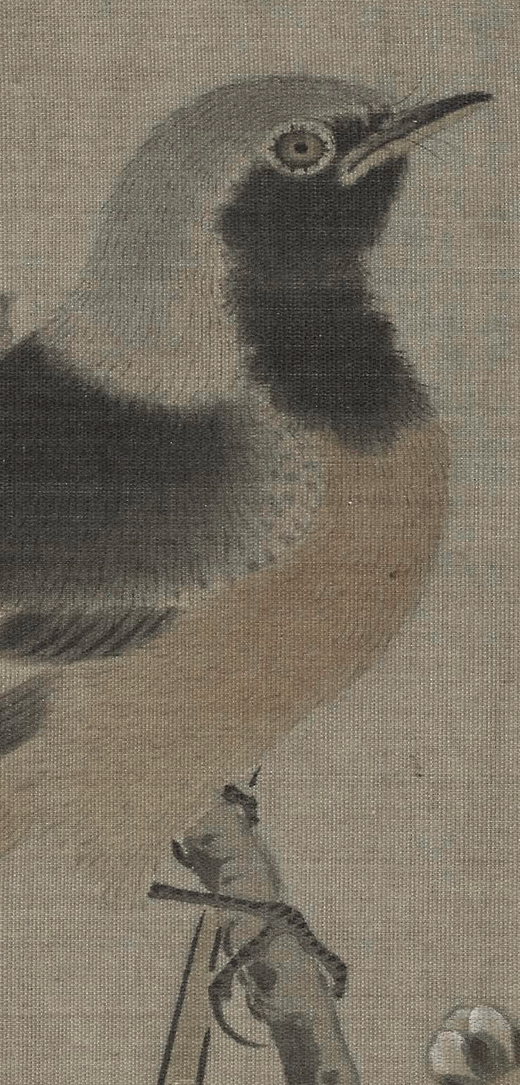 此图并未叙事,灰伯劳就这么安安静静地卧在荆棘枝上做一只美鸟,描绘精妙写实而不呆板,生气十足。枝柯坚实有力,用笔提按有致。弹雪的火候也把控得恰好,气氛轻盈而不做作。