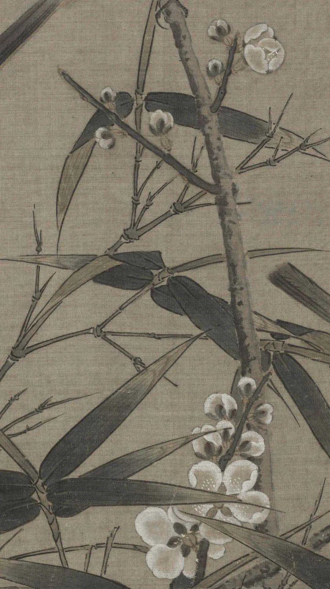 绿竹丛中逶迤伸出白梅两枝,清丽冷艳。两只鸲鹆栖于枝头,翘首顾盼。鸟羽用细笔勾描,然后以墨或淡彩晕染,近似没骨法。梅花用白粉和淡黄色勾填,层次丰富。
