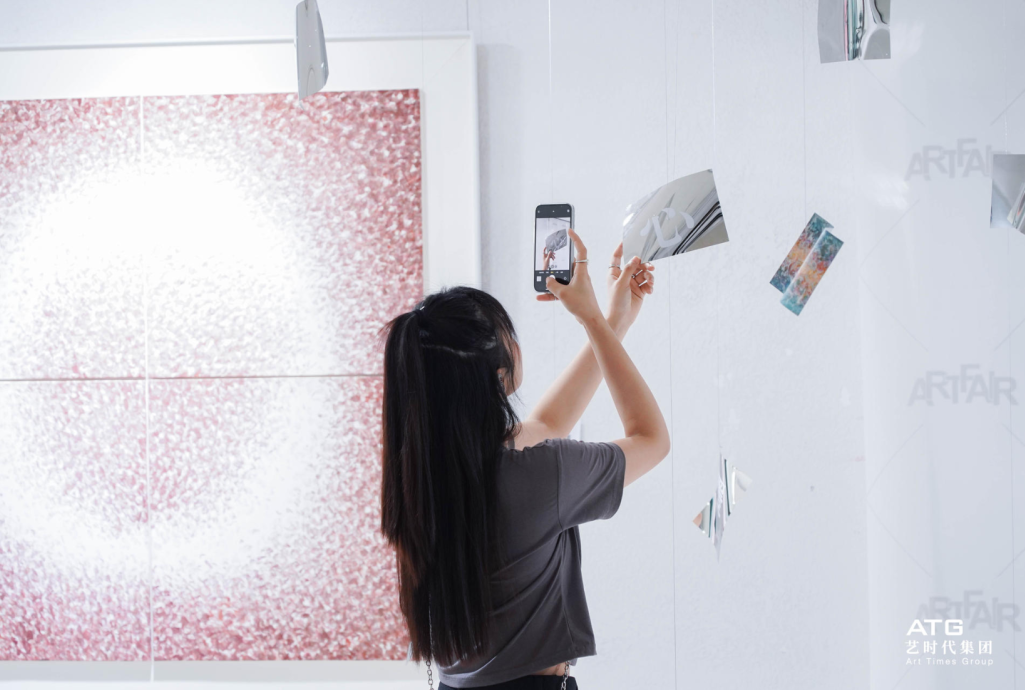 展区现场设计以“光影无限”为主题,通过打造简约、宁静的艺术对话空间,促进观者与作品的深入交流。现场,嘉宾观众纷纷在作品前合影留念,与艺术家热烈交谈。