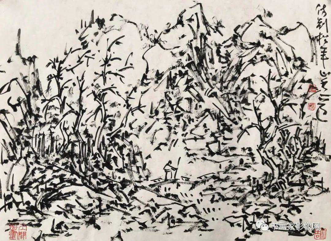 焦墨山水,惟见黑白,其笔其墨浸透着画家之意识形态与文化形态,浑身上下散发着中国哲学的迷人味道,一画之中大道充盈。。我自少年痴迷书法,于汉隶北碑晋帖及唐宋明清诸大书家浸淫近四十年,得悟画中用笔之秘。故而我的焦墨山水全是“写”,以四十年之方法和经验所达到的用笔之自如,以巧拙、虚实、刚柔、疏密、轻重、疾涩、提按、奇正、方圆之互用兼到,中正和谐,以涩老生辣、遒练古拙之运笔情致,自在书写心象,不求取悦世人,唯求法备气至,俱见性灵矣。