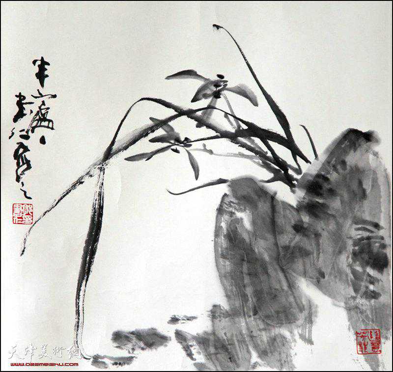 对中国画的创作来说,形神概念是伴随始终的传统命题,自东晋顾恺之提出“以形写神”后,关于两者关系的认知就变成历代画家争论的焦点,而郭书仁把自己绘画的基石建立在写生基础上的夸张与通用。曾经,他到湖北几百米的山上看兰花,听人讲述它的生长环境,观察阴晴更迭时的花朵姿态。“画花鸟,必须搞清物象的生长规律和结构,不然颠倒了就贻笑大方,在此基础上进行构图、技法和造型上的夸张变形,只要感觉像皆可通用。齐白石画虾,实际是把河虾与海虾的形象结合在一起;萧先生也跟我们讲,小鸟无名——真正的小鸟无需在意它的品类,入画即可,除了耳熟能详的不能随意造型,其他适度的艺术夸张都是可以的。”