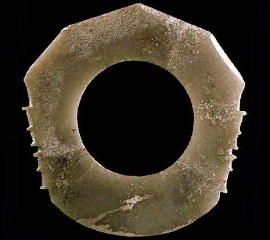两侧均有齿状扉棱,平滑,琢磨细腻,在传世品中,有的玉戚饰有兽面纹。