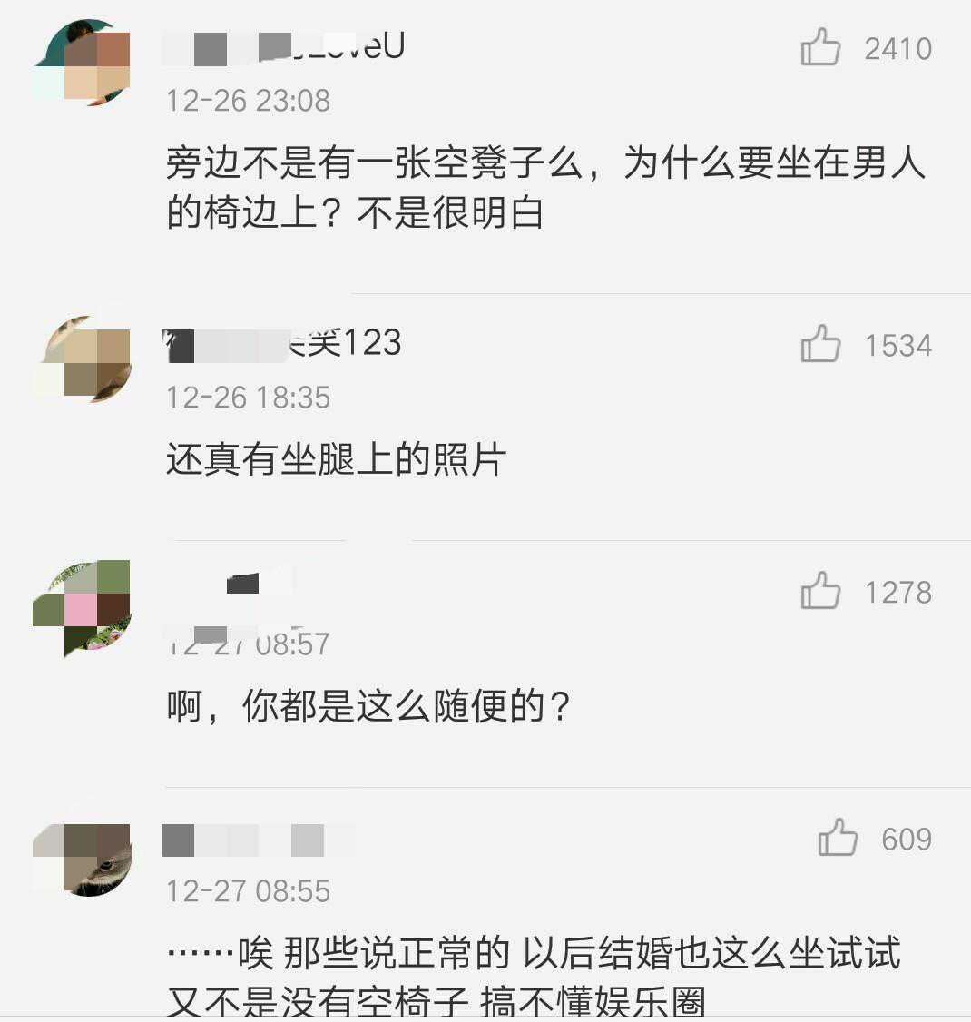 看到照片之后,有网友为杨幂辩解说这也并没有真的坐在谢霆锋大腿上,只是视觉效果比较像。也有网友认为这动作真的过份亲密了。