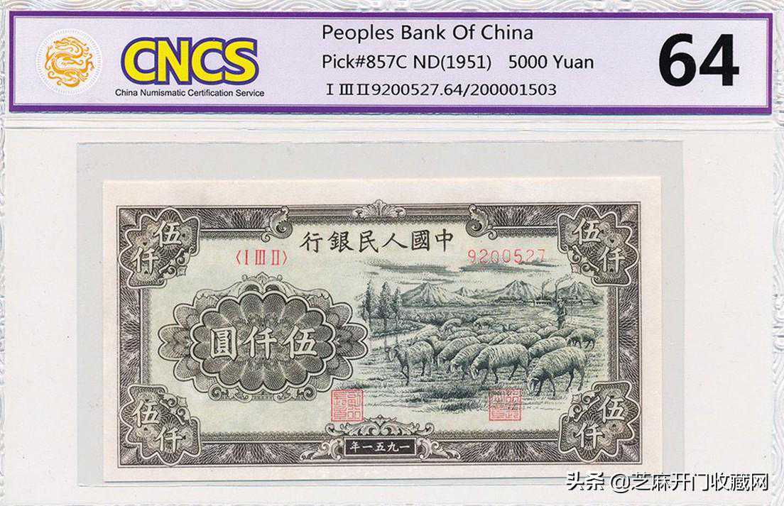 一九五一年中国人民银行伍仟圆,牧羊,64分大罕品1951,估价:HKD63000,成交价格:HKD74340