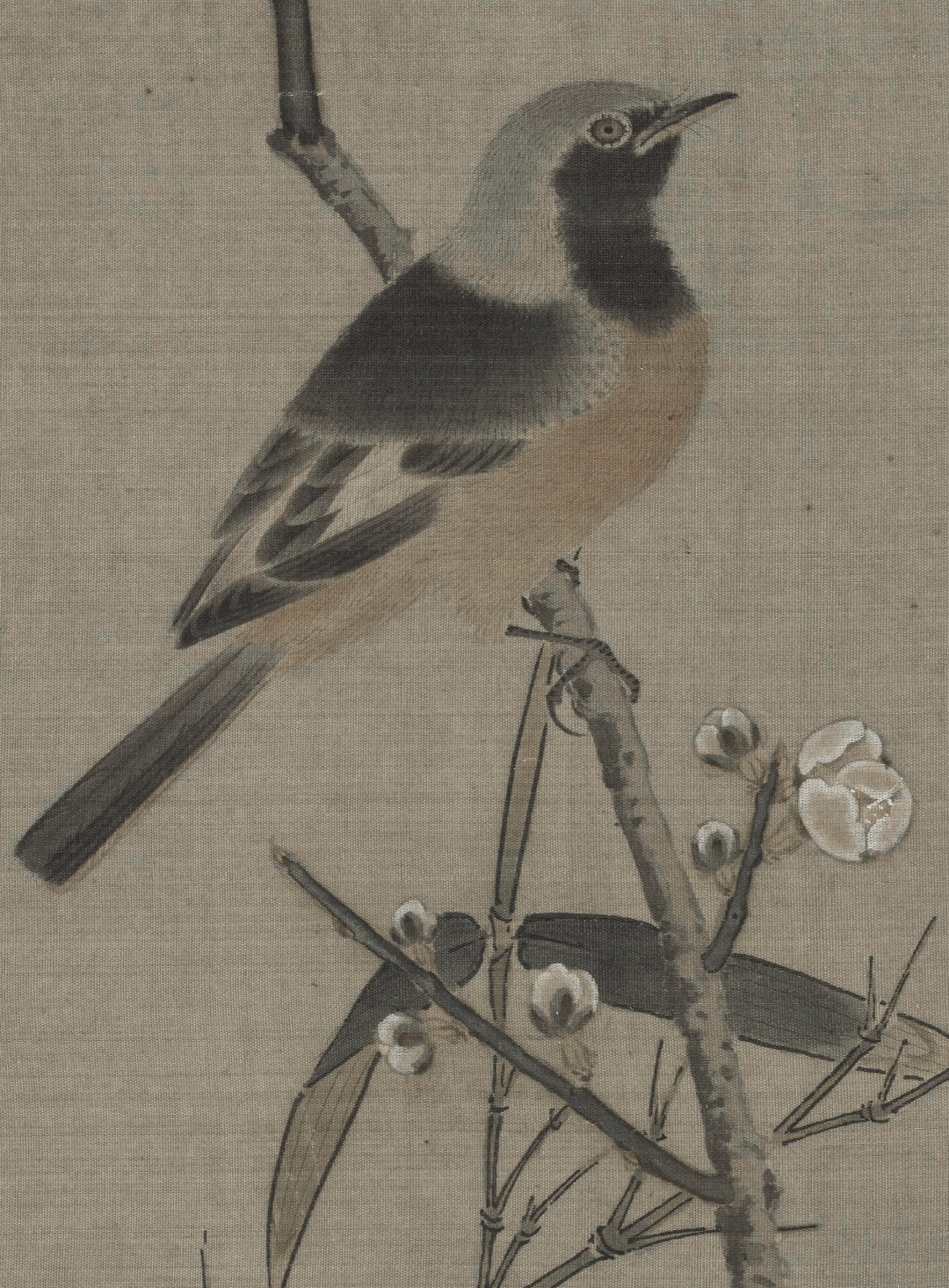 此图并未叙事,灰伯劳就这么安安静静地卧在荆棘枝上做一只美鸟,描绘精妙写实而不呆板,生气十足。枝柯坚实有力,用笔提按有致。弹雪的火候也把控得恰好,气氛轻盈而不做作。