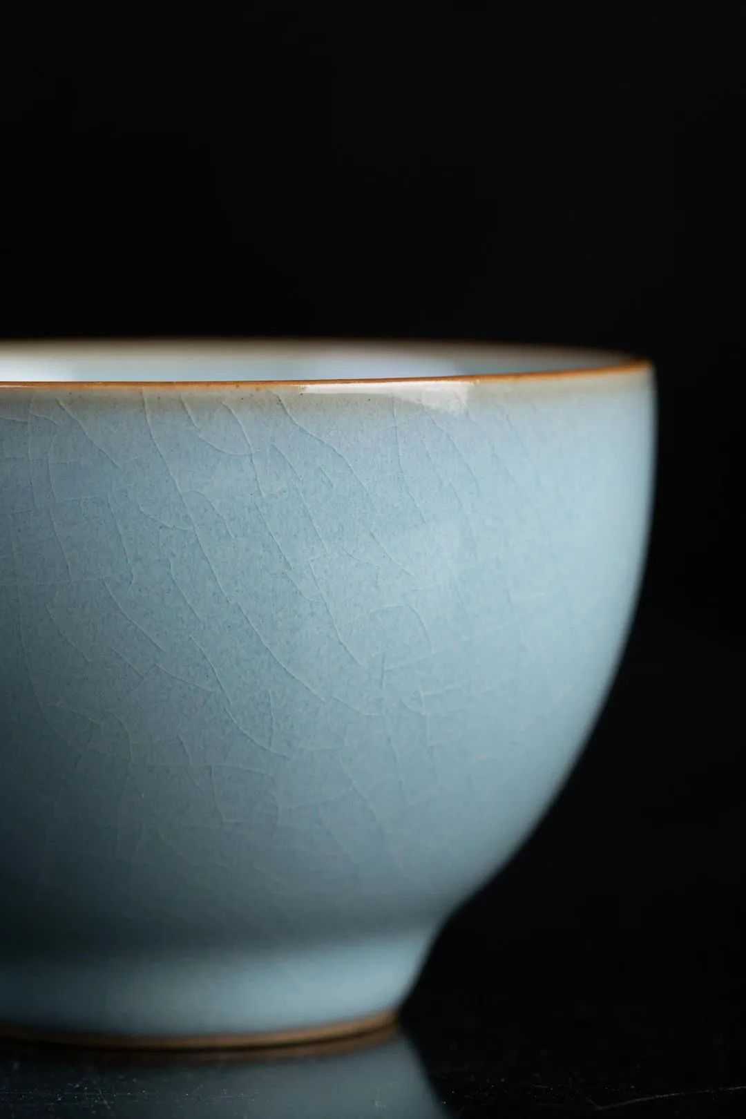 端看这汝瓷鸡心杯,是天空被雨水稀释后的清丽色彩,润度也很好,光照下还可以有反光的效果,明如镜。