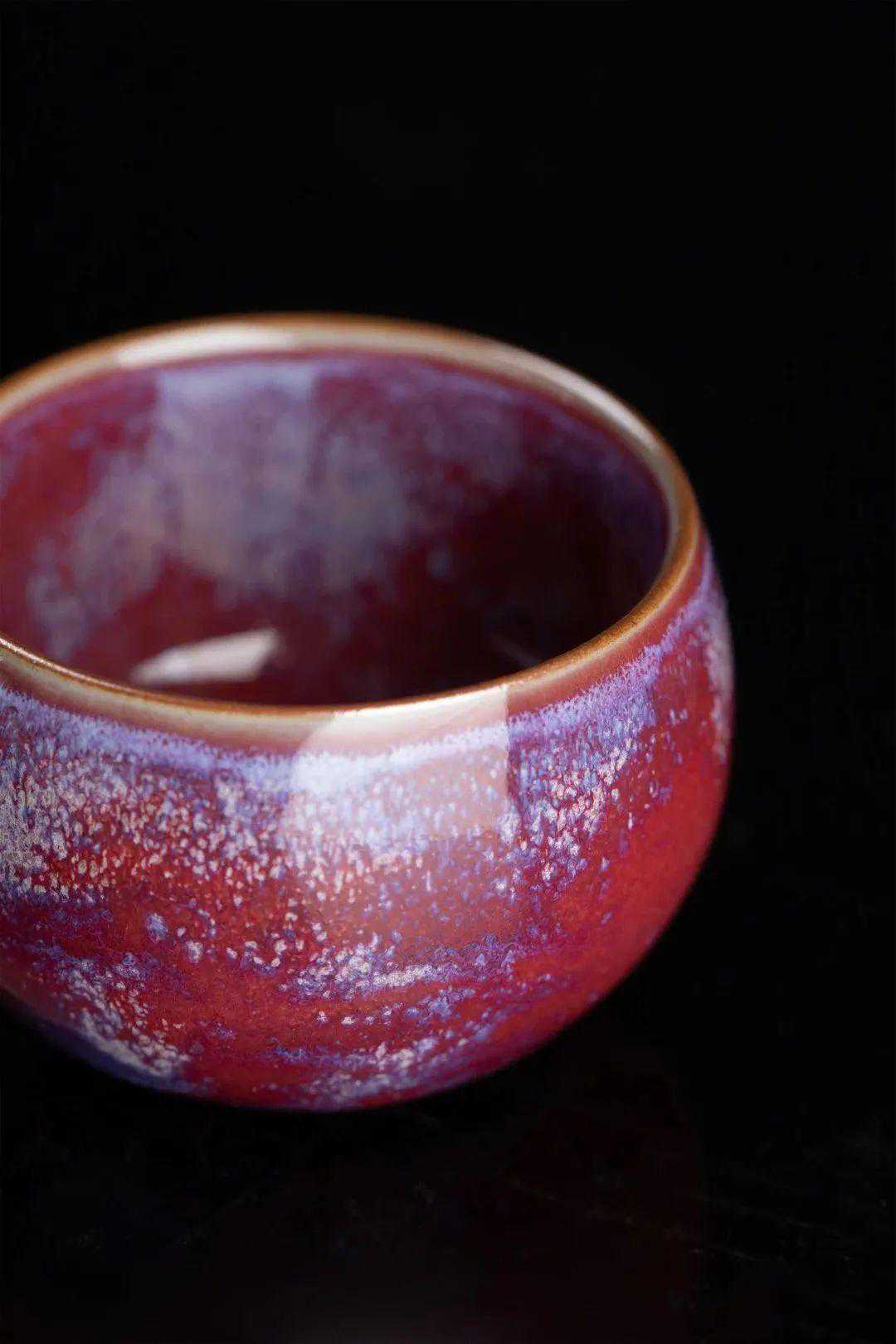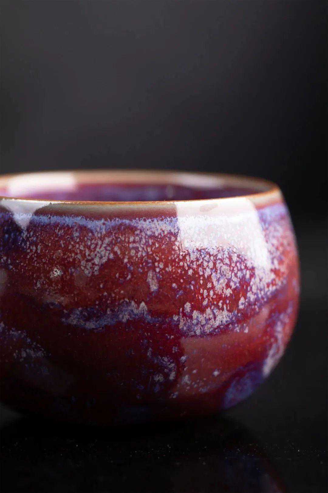 釉面赤色亮丽,层次有序,充满着自然的美感正如诗中所写“落日紫翠忽成岚”。紫蓝者斑纹交织、灿若星河,如把银河,封存于一盏之内。