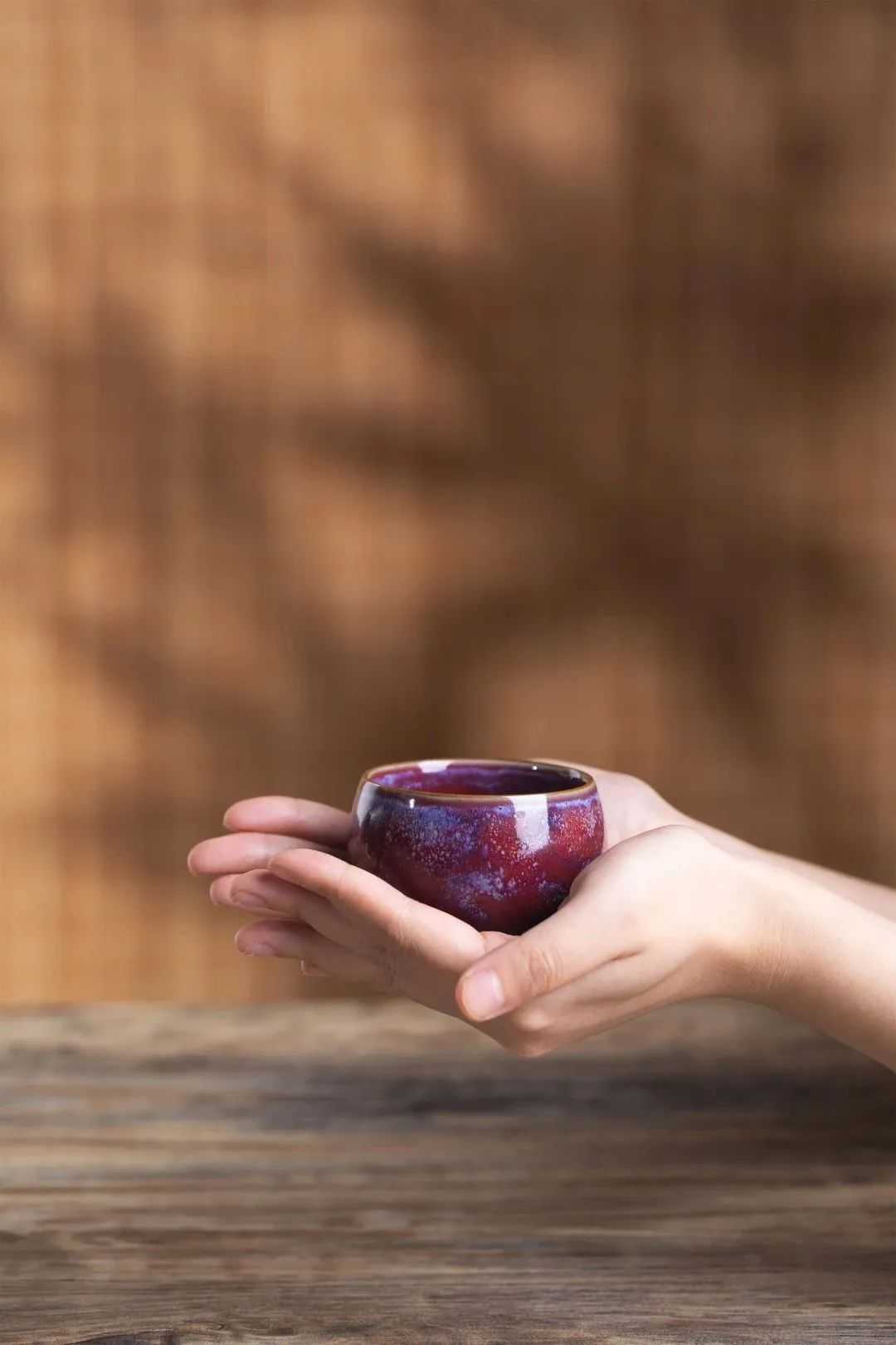 这钧瓷圆融杯,型似鼓,敛口鼓腹。胎厚釉薄,手感稳重,捏拿舒适。