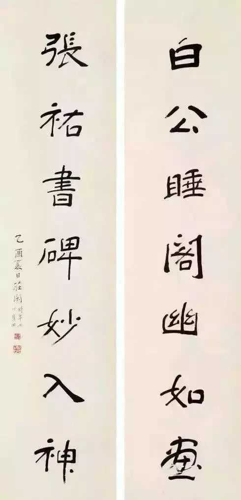《白公张祐七言联》,书于1945年,庄闲时年七十有四。联语为“白公睡阁幽如画,张祐书碑妙入神”。款识:“乙酉夏日庄闲,时年七十有四”。钦印二方。该书隶楷兼收,力蕴千钧,端庄大度,为庄闲晚年精品之作。