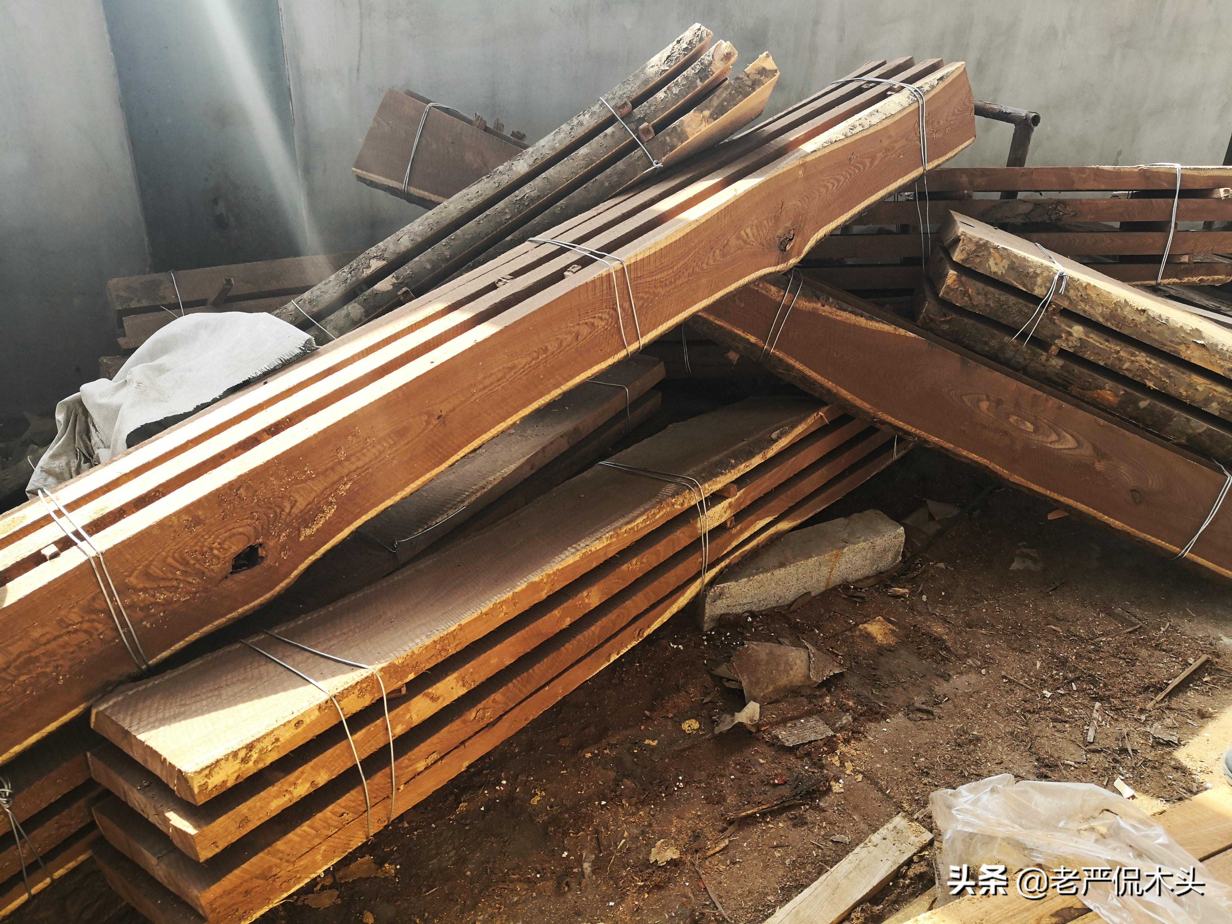 杵榆木经过长时间的存放,会变成漂亮的红棕色,这是在另一堆老料中拍到的。当时老板答应送我两块。感谢我那贪心的同伴,二话不说直接找来叉车,将我挑出来的两块板直接丢到了车上。幸亏如此,不然也会如同那捆黑心槐一样,落得个失之交臂的结果。