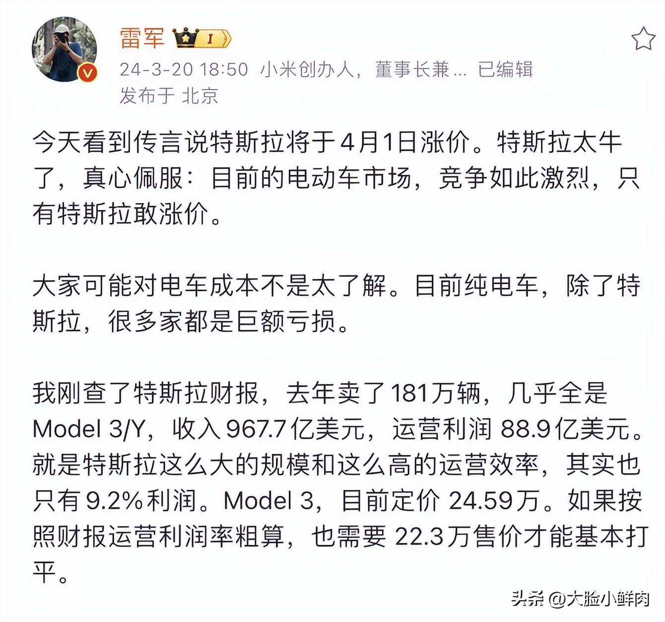 雷军曾在微博向广大网友科普,新能源汽车利润很低,就算是马斯克的特斯拉利润也只有大约9.2%。