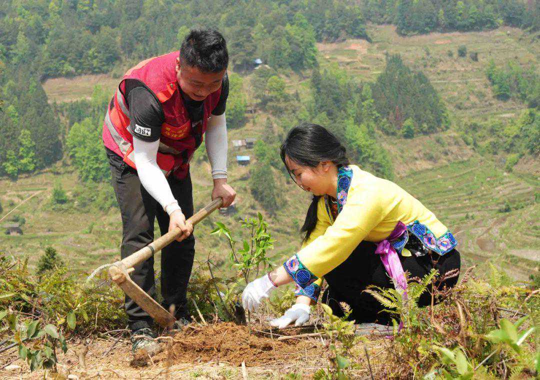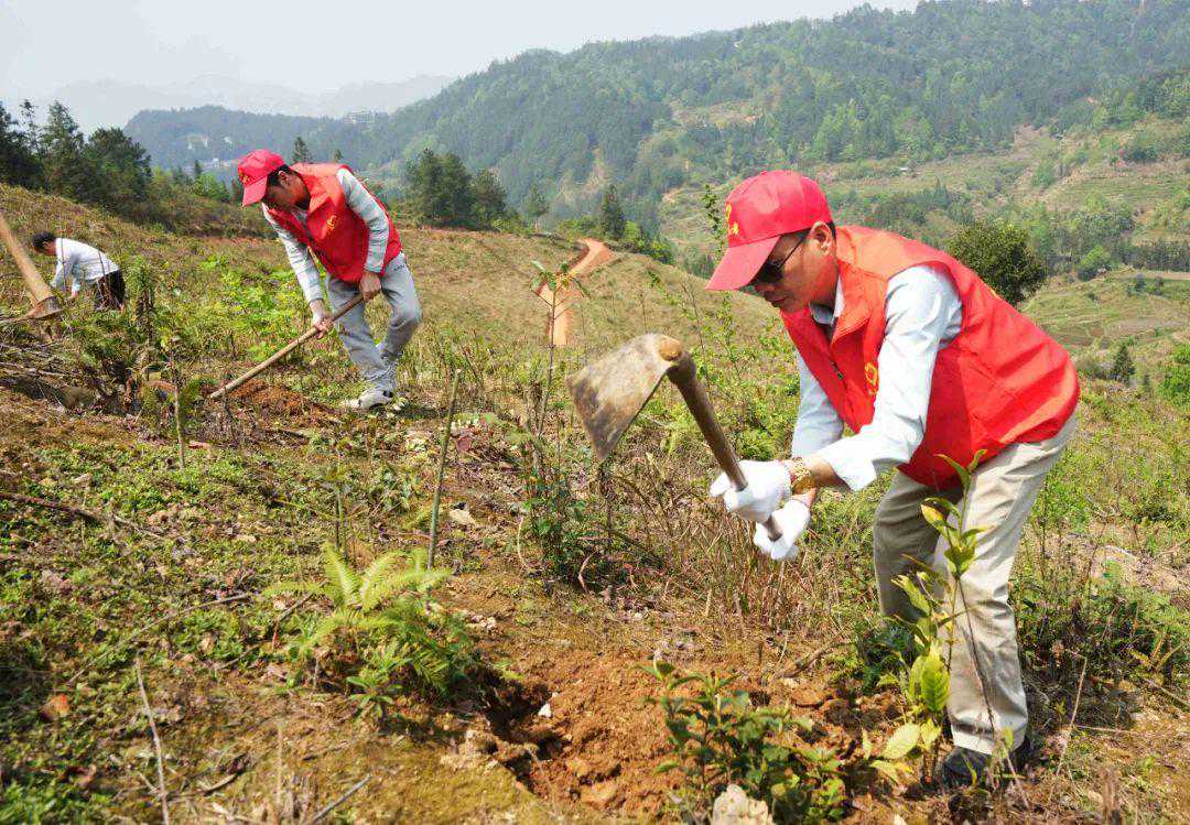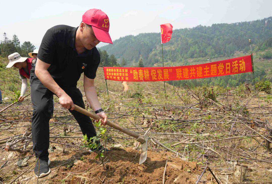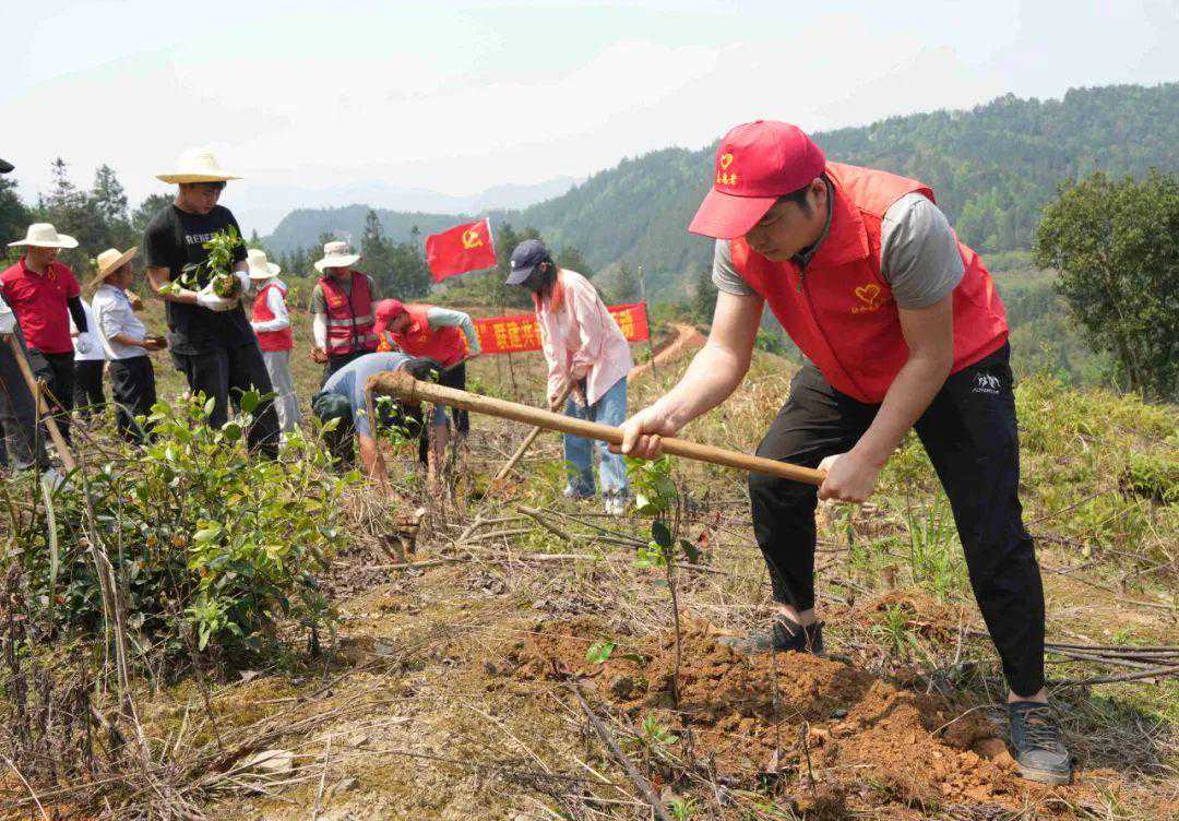 4月2日,县政府办党总支、红水乡政府党支部和振民村党支部共60多名党员组成党员志愿服务队,帮助红水乡振民村村民栽种油茶树,助力春耕生产。