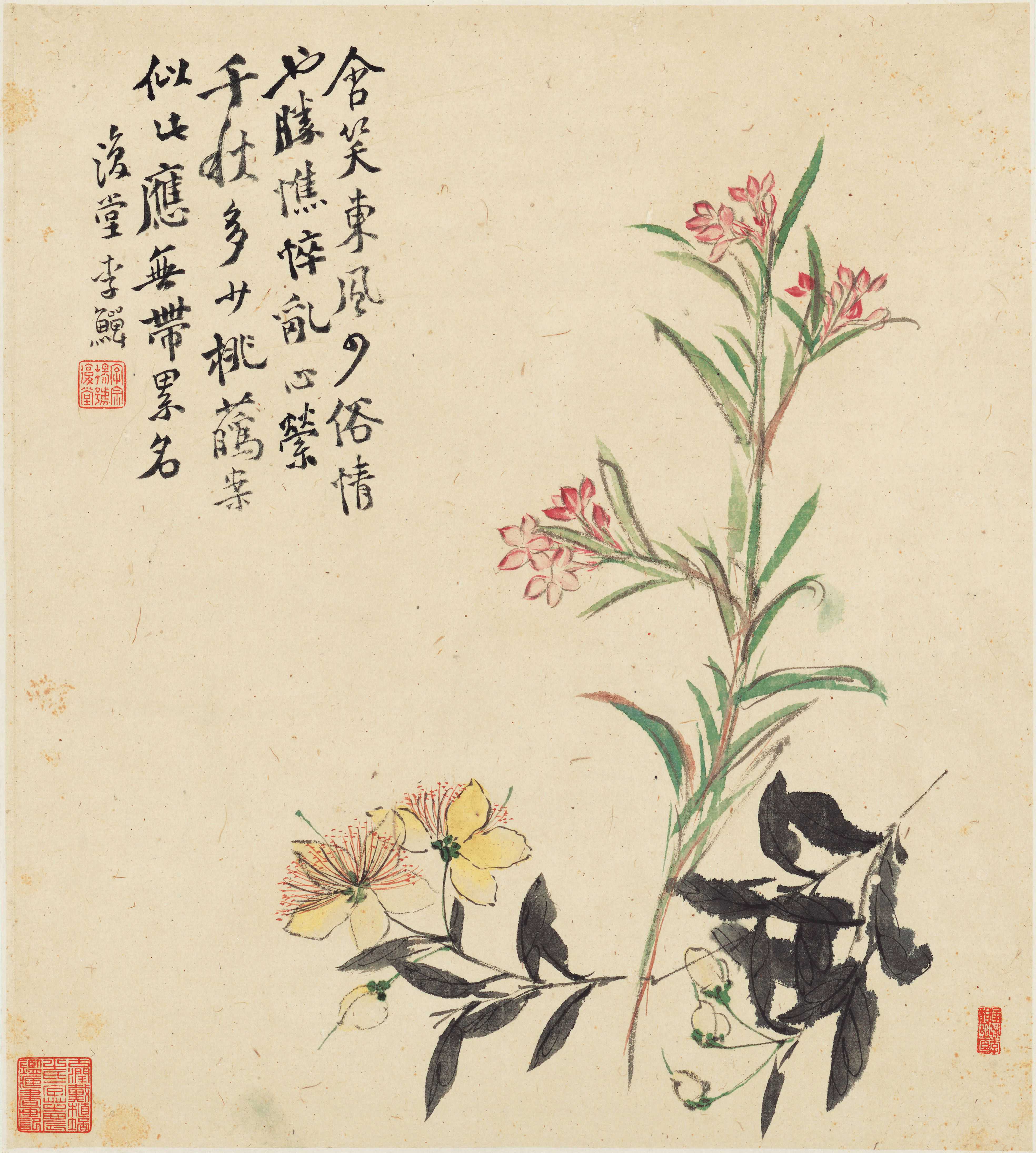 李鱓绘画大致分为早期及中后期,风格大有不同,早期绘画受到沈周、周之冕的影响,所画花鸟画笔墨清淡,细笔勾勒画中的花瓣,以书入画,笔墨自如,灵动十足。中后期,李鱓的笔墨技法开始变化,从细笔写意走向狂发自如,不受传统笔意的影响,独具创新意识,画面效果生动自然。
