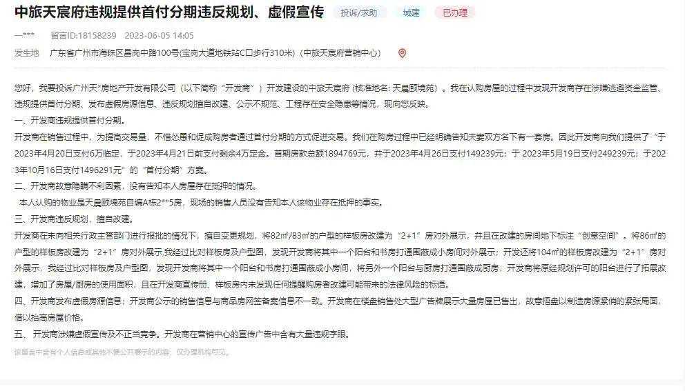 值得一提的是,项目2023年还被投诉存在涉嫌违规提供首付分期、虚假宣传等问题。