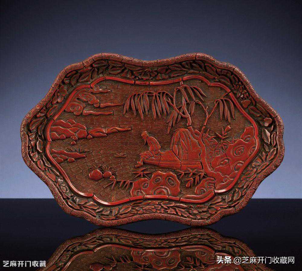 3:元剔红「濯足」图海棠式盘,尺寸:宽24.1厘米,估价:HKD70万-90万,成交价:HKD218万