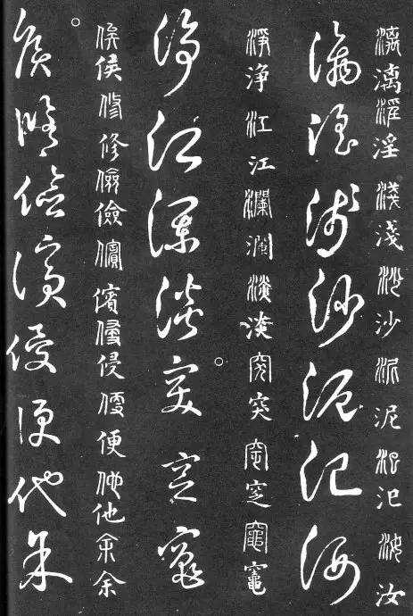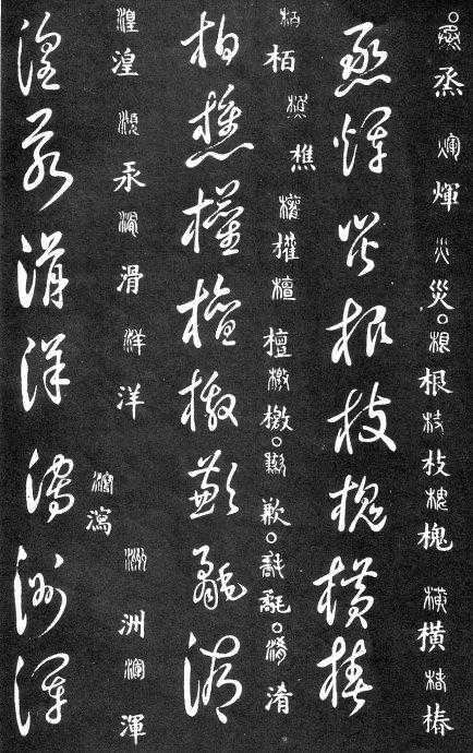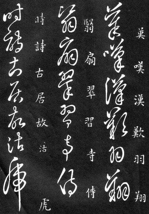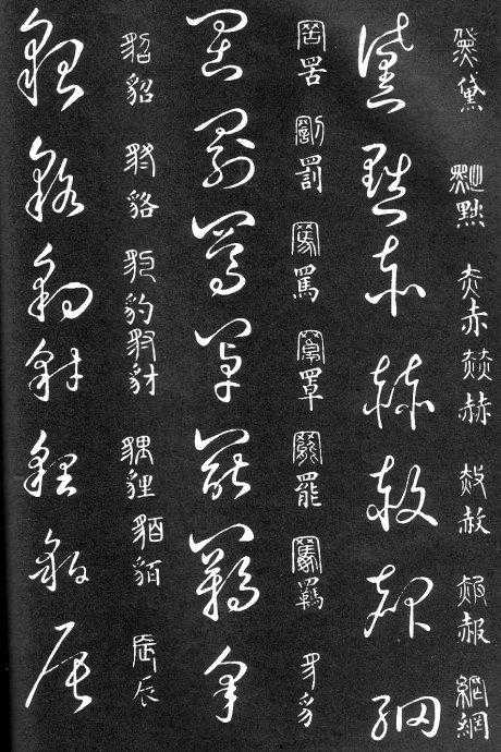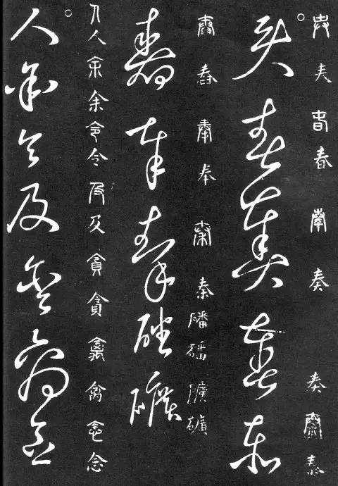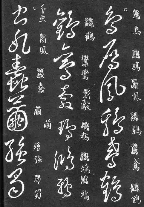 草书在唐代出现了以张旭、怀素为代表的狂草,成为完全脱离实用的艺术创作.狂草亦称大草,笔意奔放,体势连绵,如唐朝张旭《千文断碑》、《古诗四道》,怀素僧《自叙帖》等等,,张旭史称“草圣”,孙过庭《书谱》字字区别,不相连接,而笔意活泼、秀媚。“大草”与“小草”相对称,大草纯用草法,难以辨认,张旭、怀素善此,其字一笔而成,偶有不连,而血脉不断。清朝冯班《钝印书要》谈学草书法云:小草学献之、大草学羲之,狂草学张旭不如学怀素。怀素的草字容易辨认,字迹清瘦见形,字字相连处亦落笔清晰易临。张旭字形变化繁多,常一笔数字,隔行之间气势不断,不易辨认,形成一种独特的风格,韩愈《送高闲上人序》中提到张旭草书以“喜怒窘穷,忧悲愉佚,怨恨、思慕、酣醉、无聊、不平,而有动于心,必于草书挥毫发之”,故学张旭难。