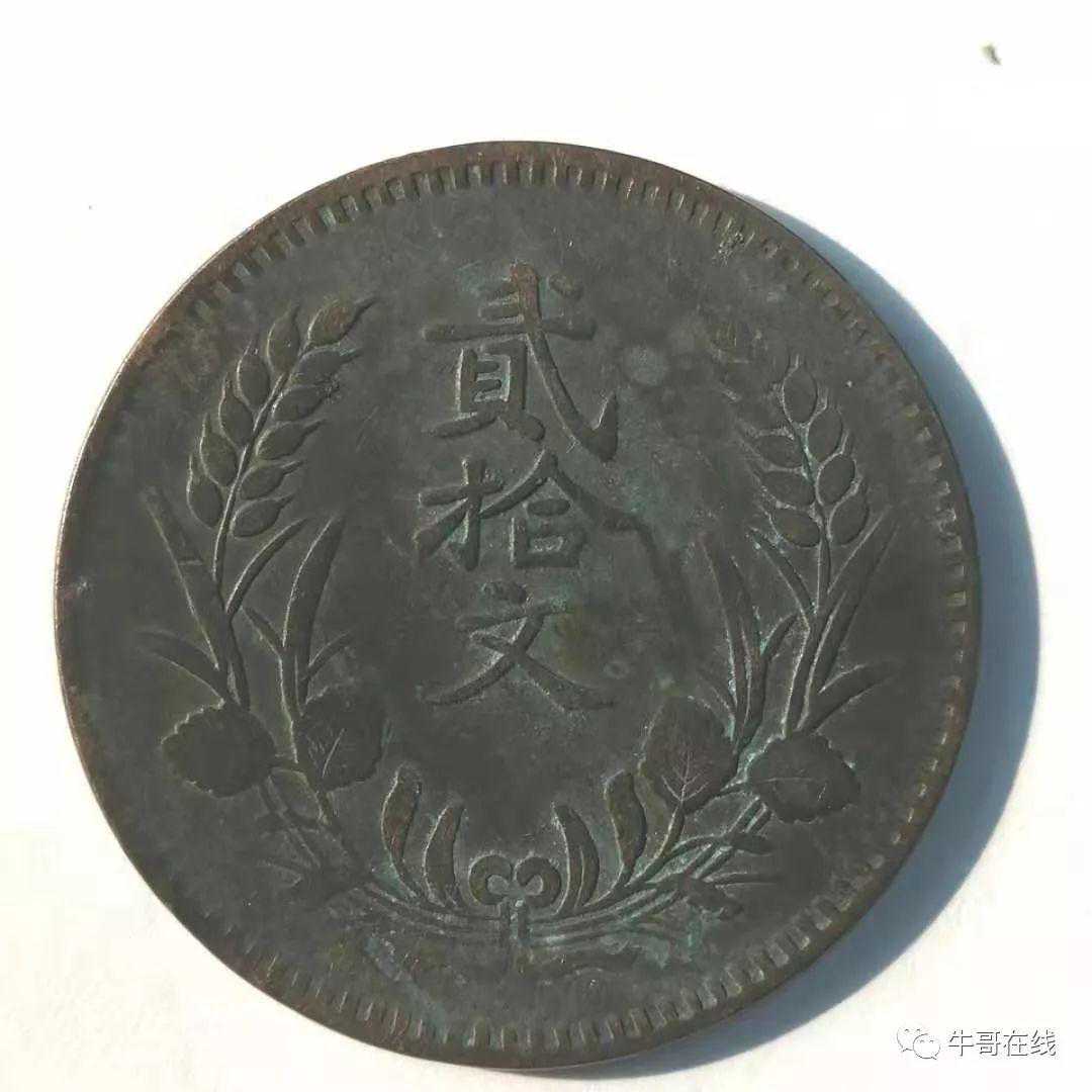 其三:民国十年中华铜币20文中“贰拾文”,为无“贝”贰。该币嘉禾面饱满,“贰”字略斜立于“十文”之上,似卧非卧,别有韵味,为砂版20文少见版式。