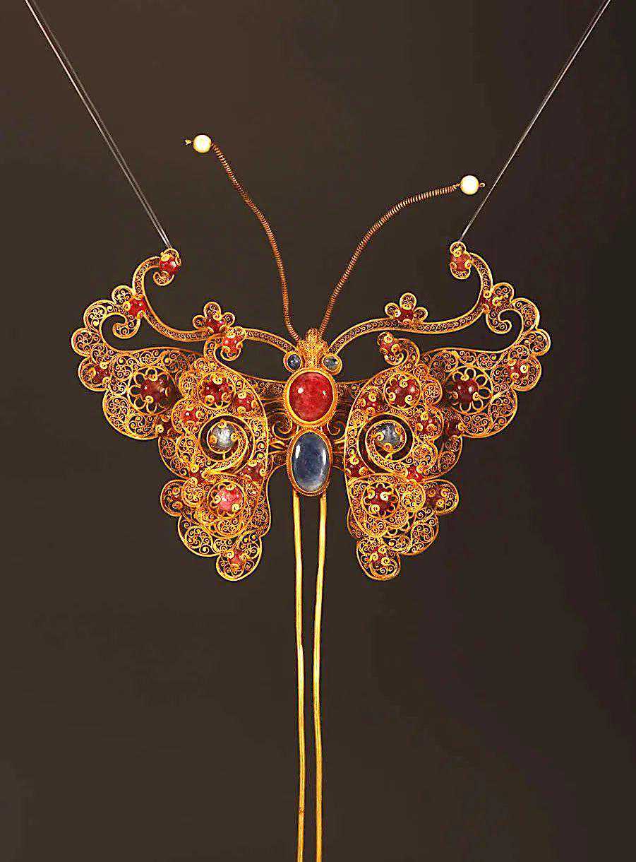 “云鬓花颜金步摇,芙蓉帐暖度春宵”。这一件垒丝镶红蓝宝石蝴蝶形金步摇,以金丝圈出的蝴蝶轮廓内焊接累丝卷草纹,蝶须轻颤。可以想象当时的女子头戴步摇、小步轻盈的曼妙身姿。