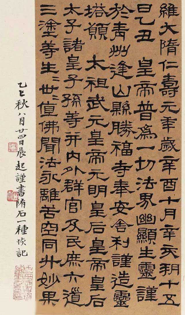 陆恢书青州舍利塔下铭,款署:乙巳(1905)秋八月廿四日,晨起谨书隋石一种。恢记。