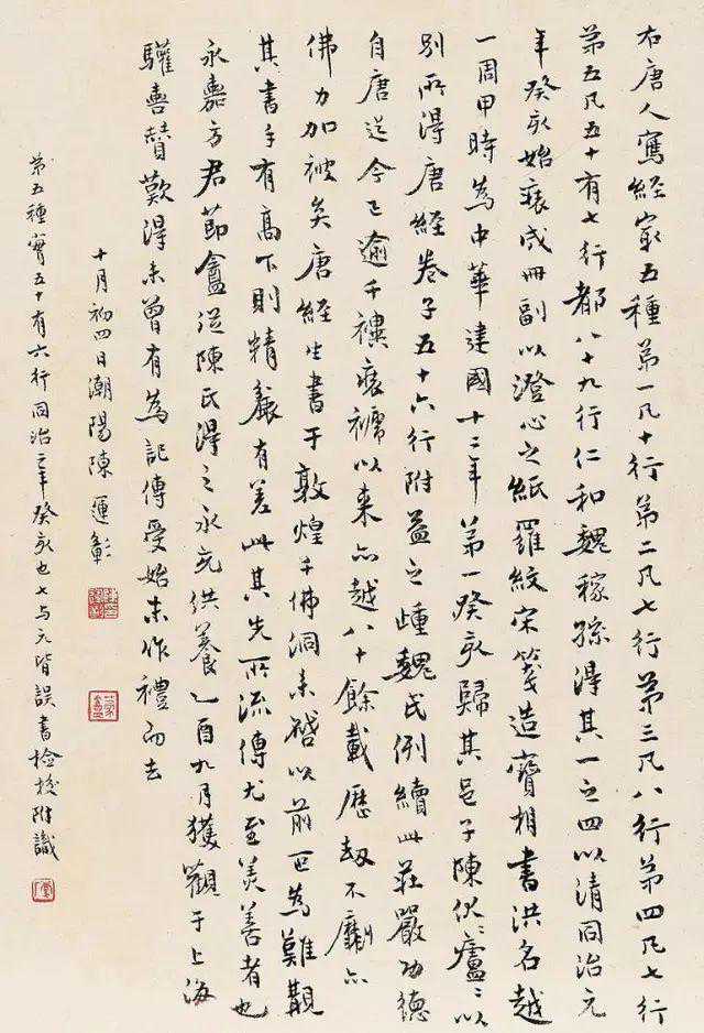 陈运彰(1905-1955):右唐人写经最五种,第一凡十行,第二凡七行,第三凡八行,第四凡七行,第五凡五十有七(六)行,都八十九行。仁和魏稼孙得其一之四,以清同治元(二)年癸亥始装成册,副以澄心之纸、罗纹宋笺,造宝相书洪名。越一周甲,时为中华建国十二年第一癸亥(1923年)归其邑子陈伏庐,伏庐以别所得唐经卷子五十六行附益之。踵魏氏例,续此庄严功德。自唐迄今已逾千祀,装褫以来亦越八十余载。历劫不劘,亦佛力加被矣。唐经生书于敦煌千佛洞未启以前,叵为难觏。其书手有高下,则精麄有差。此其先所流传,尤至美善者也。永嘉方君节庵从陈氏得之,永充供养。乙酉(1945)获观于上海,欢喜赞叹得未曾有,为记传受始末,作礼而去。十月初四日潮阳陈运彰。第五种实五十有六行,同治二年(1863)癸亥也,七与元皆误书,检校附识。