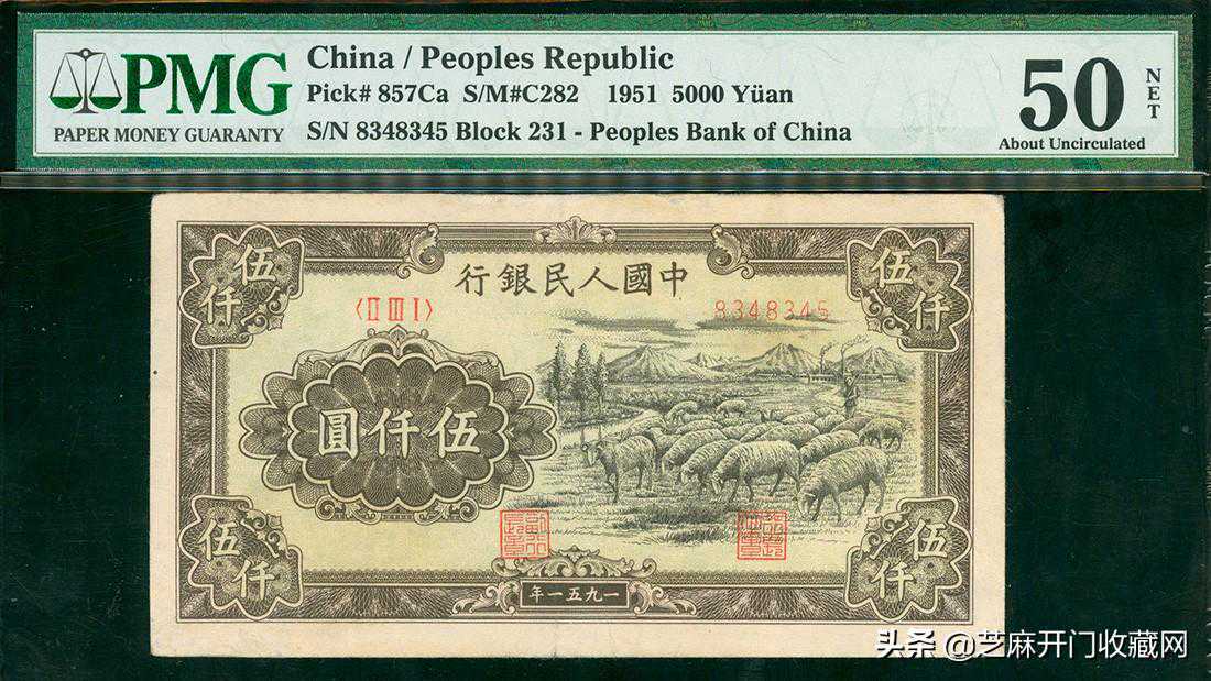 一版人民币5000元(牧羊群)编号8348345,PMG50NET,估价:HKD45000-55000,成交价格:HKD62400