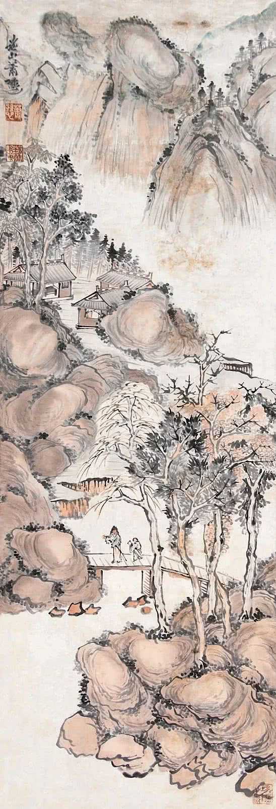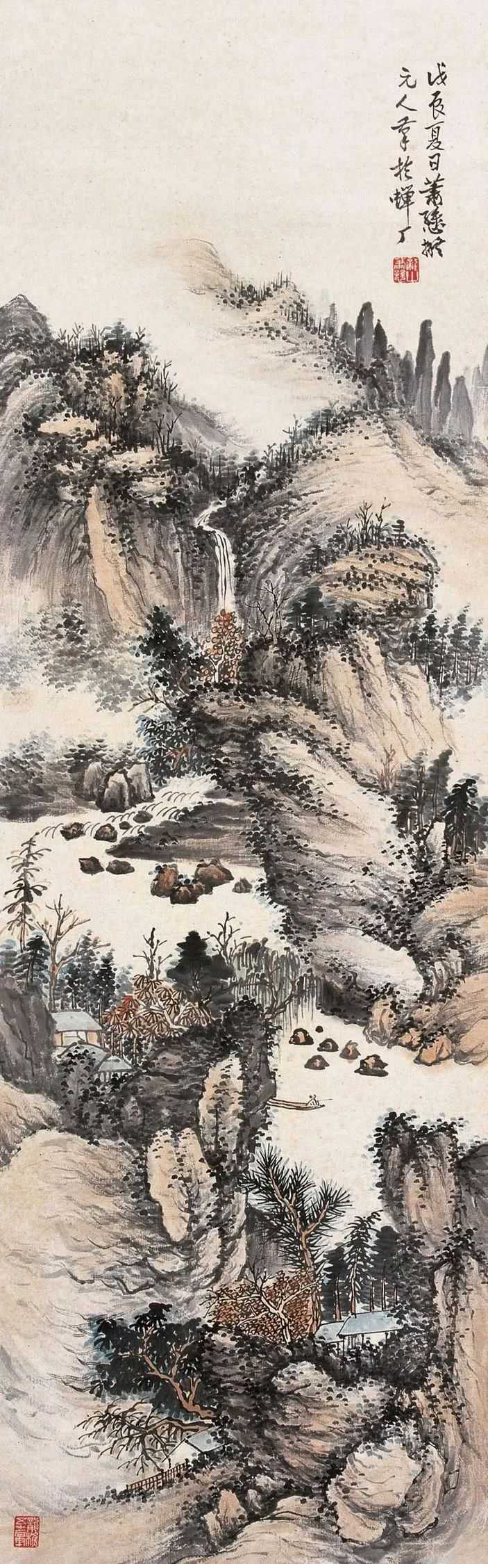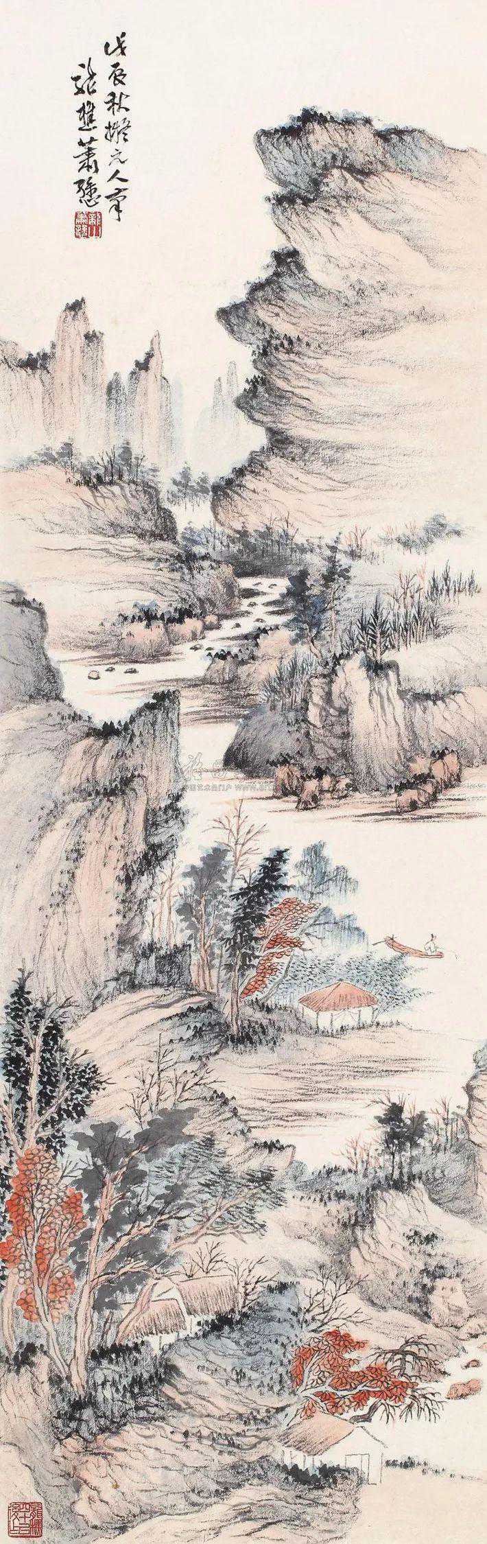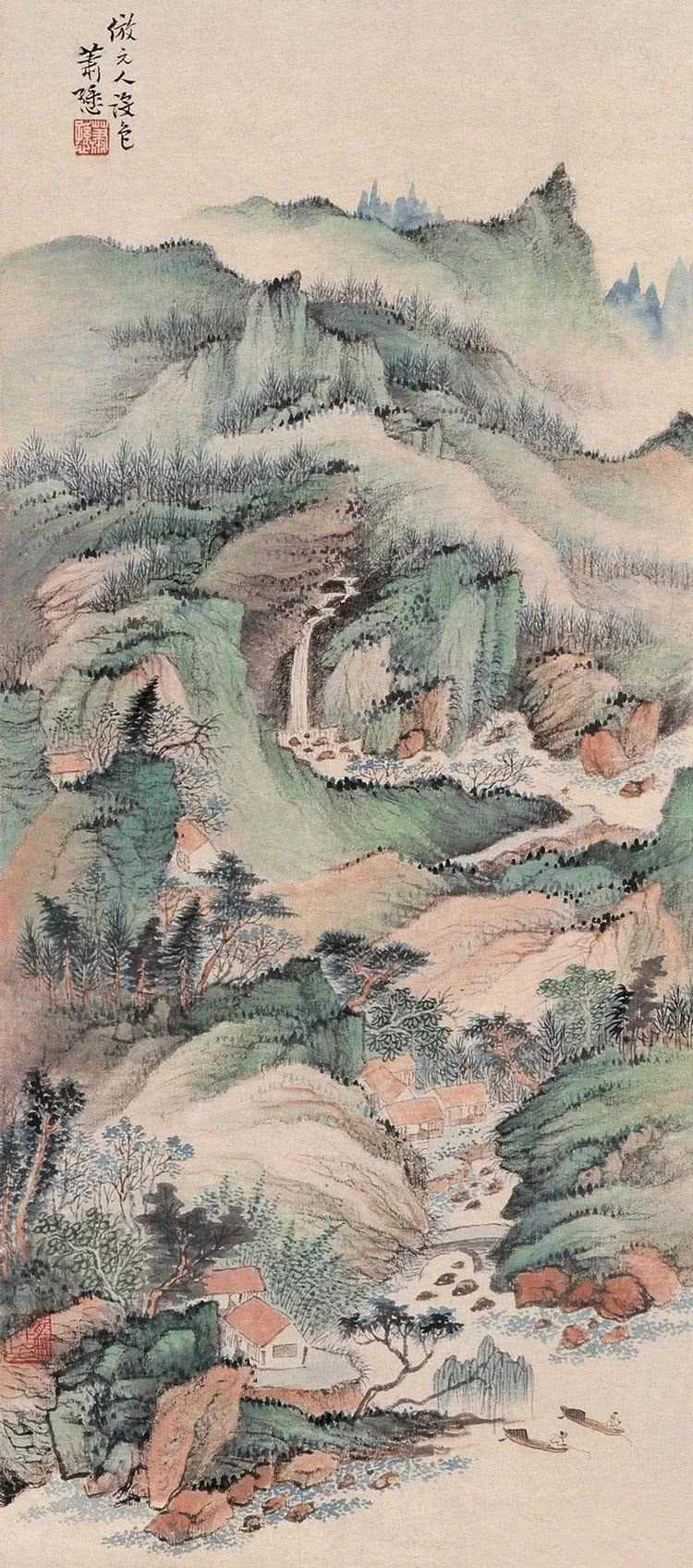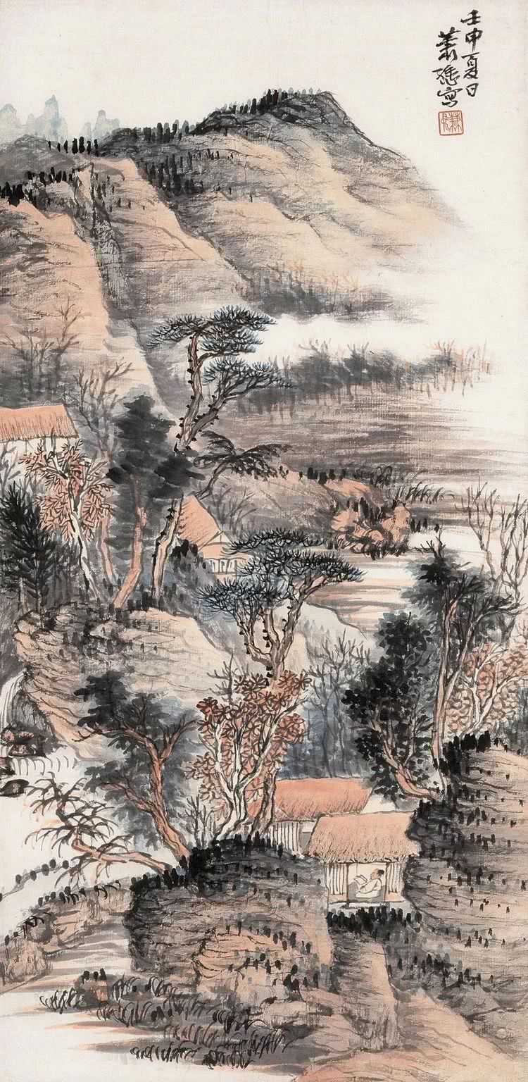 萧谦中(1883-1944)原名萧逊,早年师从姜筠学习山水画,成绩显著。后出游西南、东北名胜,行万里路,开阔艺术视野。1921年重返北京,广泛涉猎历代名家作品,深得传统艺术精华,尤醉心石涛、龚贤、梅清。1920年与周肇祥、金城、陈师曾等人发起成立中国画学研究会。曾任教北京美术专科学校及中国画学研究