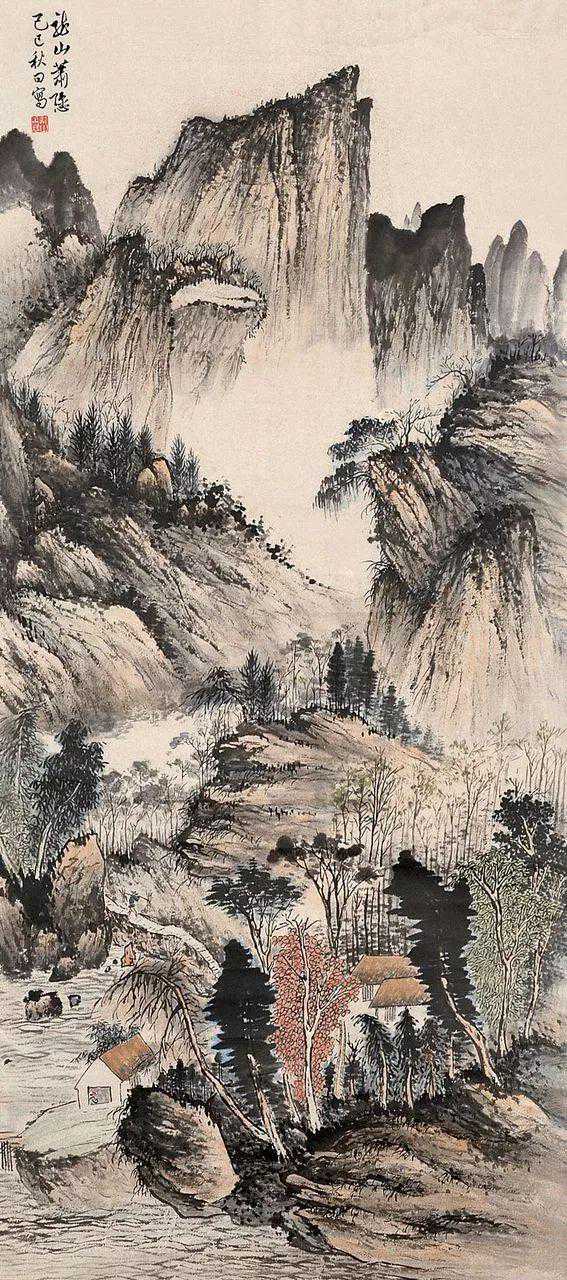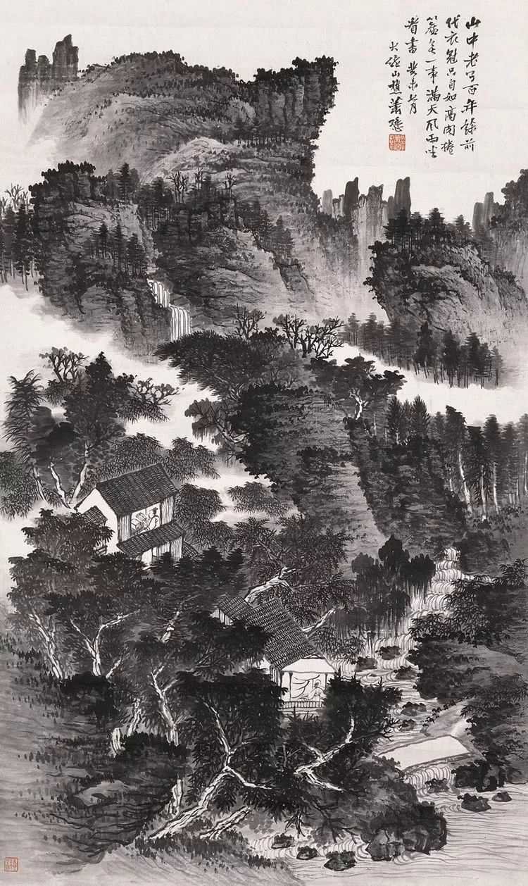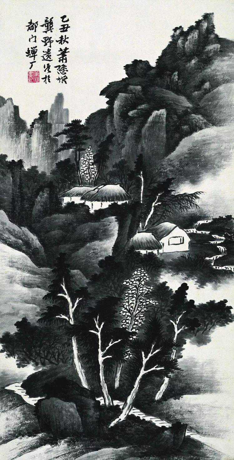 萧氏初从临“四王”山水起步,后涉宋元诸家,受明清之际黄山画派影响较大。对于前贤,最推崇龚半千,从龚半千遗法中融汇、提炼,使其皴、擦、点、染、干、润、浓、枯综合表达极为优美,笔下境界气势苍莽,雄浑深秀所作山水往往山重水叠,构图饱满,但层次分明,用墨及赋彩。