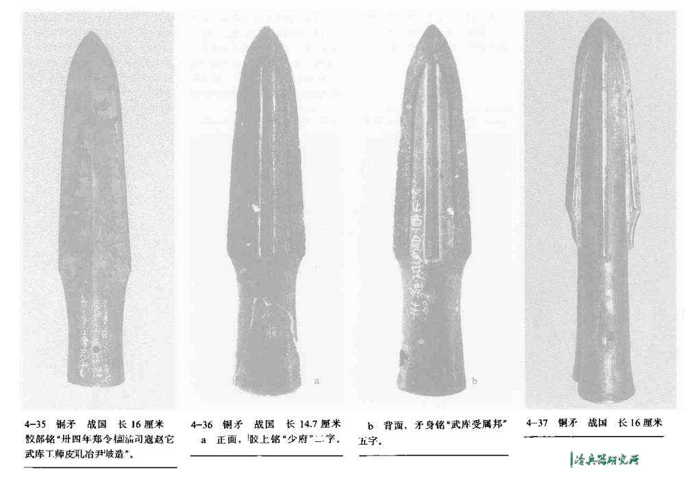 同战国时期北方大多数国家的产品相同,秦陵出土矛头也都有小篆铭文,多为简单编号,为制造年号、部门、工和监管官吏的信息代号,秦代兵器制造官吏制度之严密可见一斑。