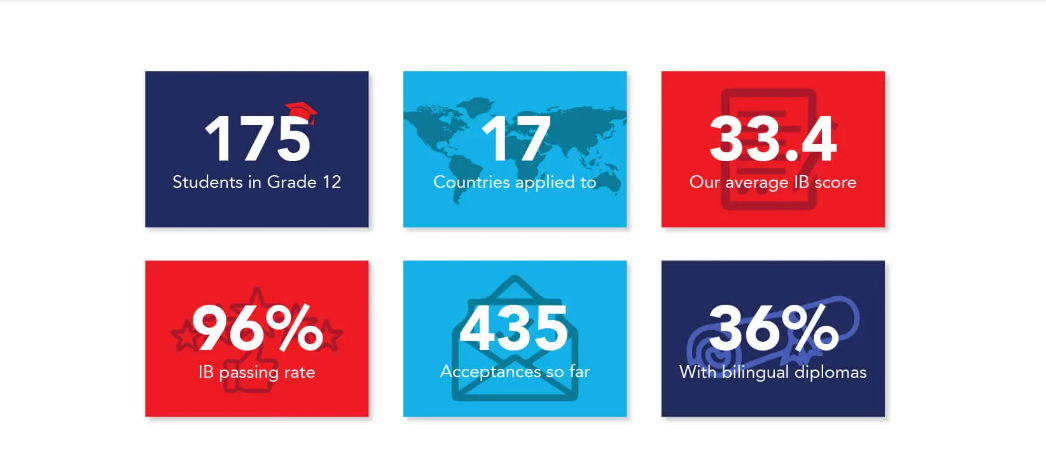 100%学生都获得完整的IB文凭,前往英国、欧洲、北美、澳大利亚和新加坡,进入自己首选的理想院校。
