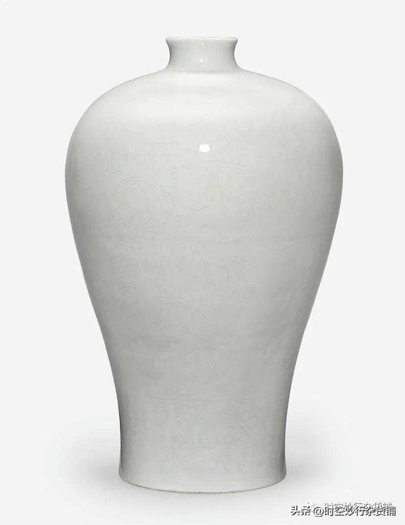 瓶小口,肩下渐敛,足胫处略外撇,圈足,砂底无釉。通体施甜白釉,釉面暗划3组纹饰,依次为卷草纹、缠枝莲花纹、折枝花卉纹,以弦纹间隔。此梅瓶保持了宋代梅瓶器身修长挺拔的特点,适当压缩了瓶身的高度,放宽了肩部和足部,使各部位比例更趋谐调。瓶体所施甜白釉纯正洁净,色泽柔润,纹饰刻划细腻,是永乐时期甜白釉瓷器中不可多得的珍品。