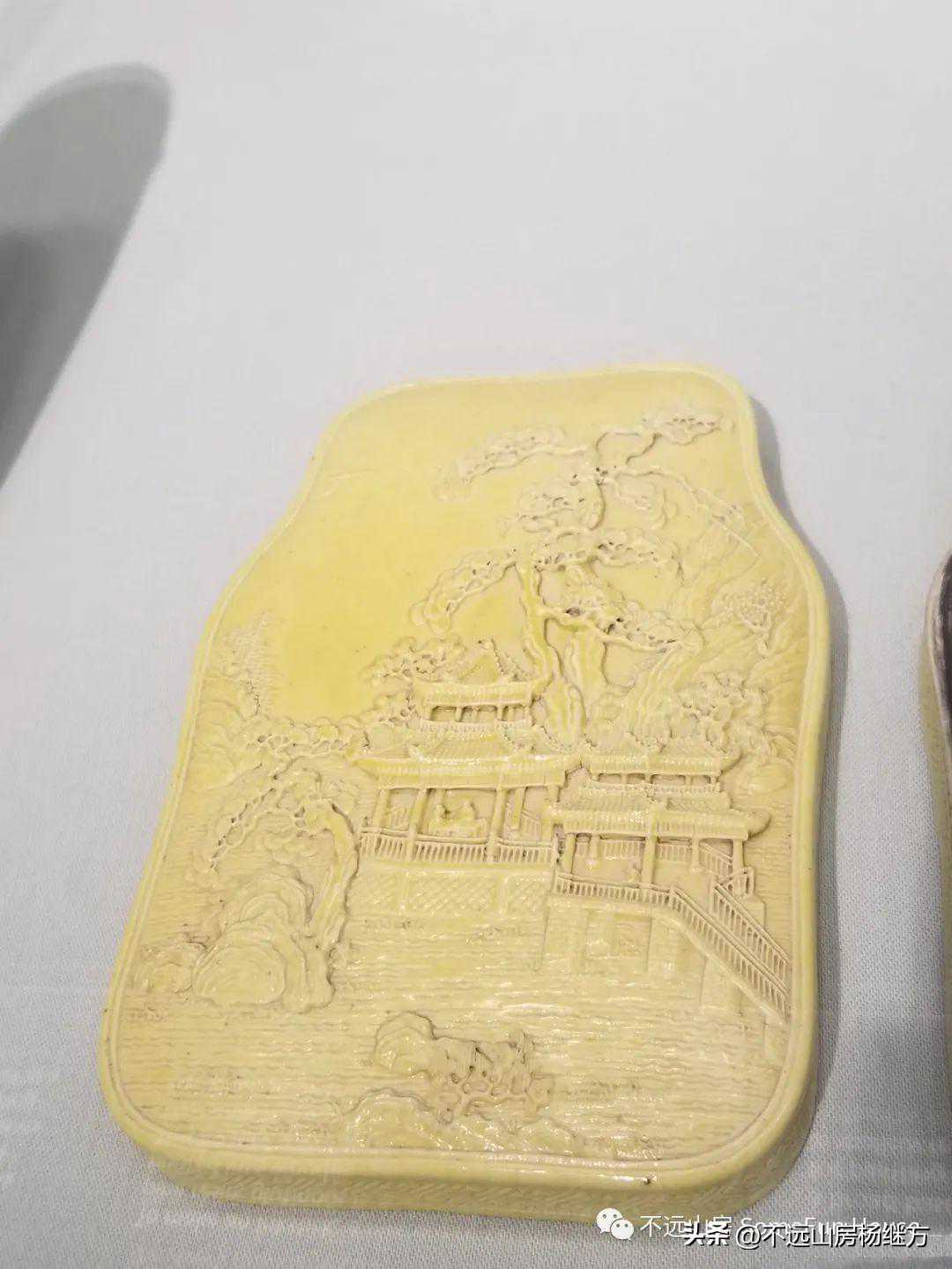 旧金山亚洲艺术博物馆清乾隆胆黄釉瓷雕山水图砚盒
