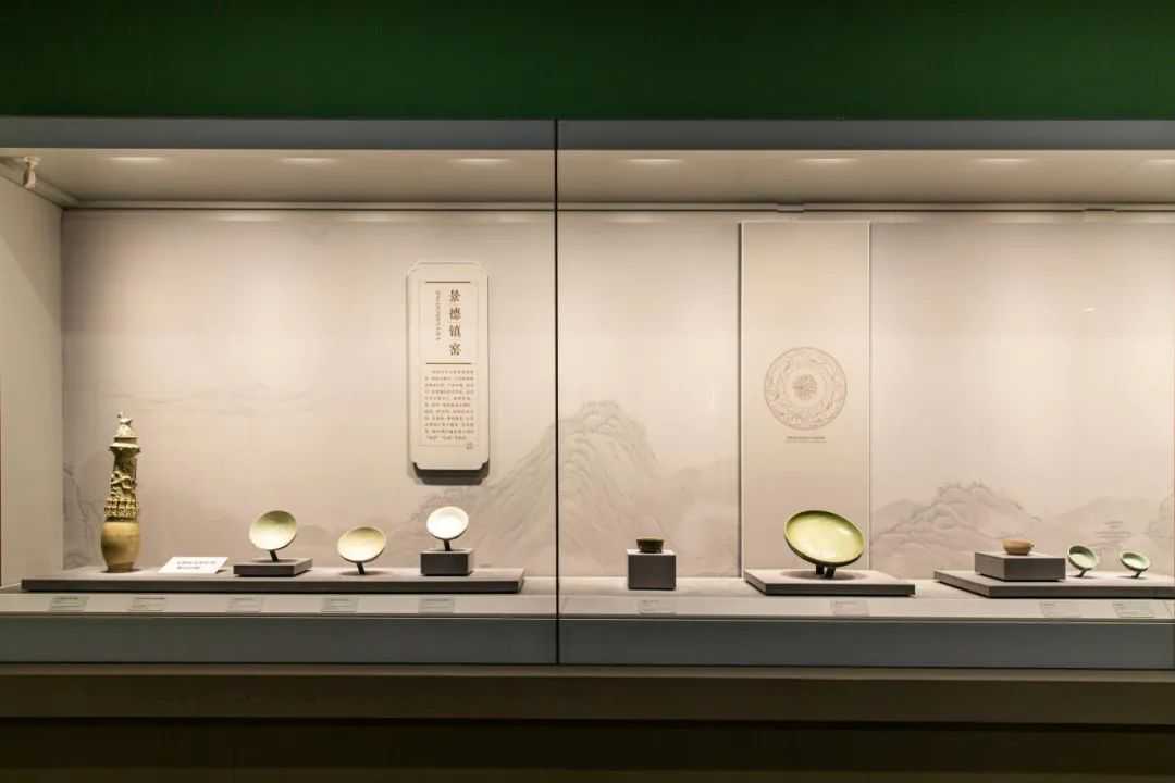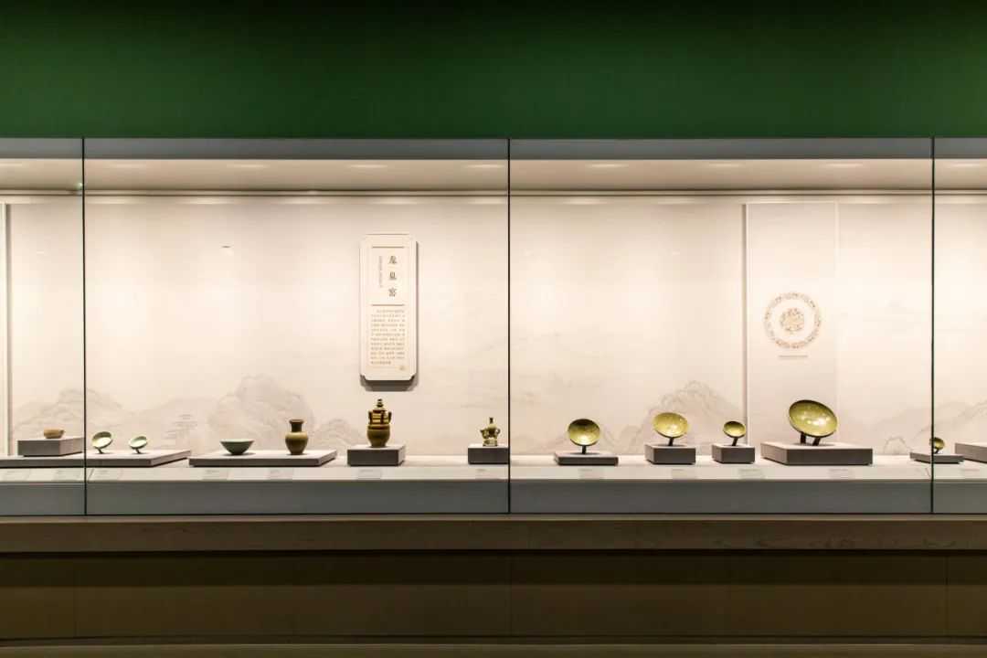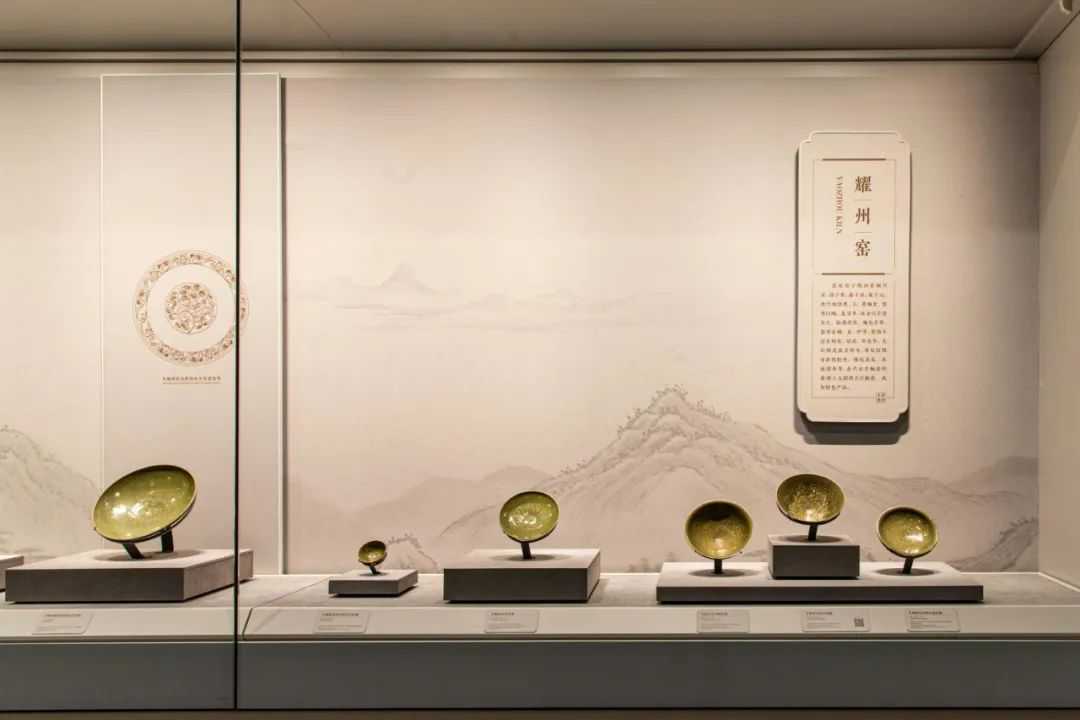 《名窑聚珍》部分汇聚了南北方各大名窑的珍品,其中将北方耀州窑青瓷、南方龙泉窑青瓷以及景德镇窑青白瓷设计在一个通柜之中,展示了宋元时期用铁元素呈色的釉在不同的还原气氛下呈现出的不同色调,整个展柜就是一张青色调的色卡。配合前一展柜的北方白瓷和后一展柜的南方黑瓷,在相对独立的展示空间内,南北方单色釉瓷器错落缤纷,遥相呼应,呈现出了很好的艺术效果。