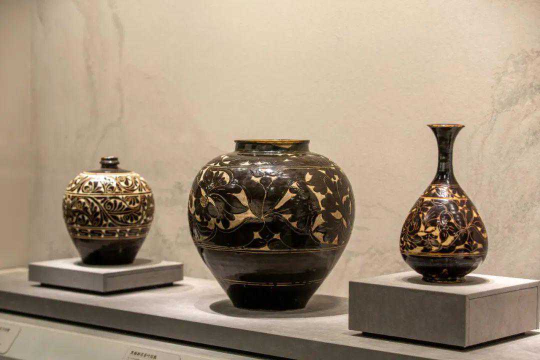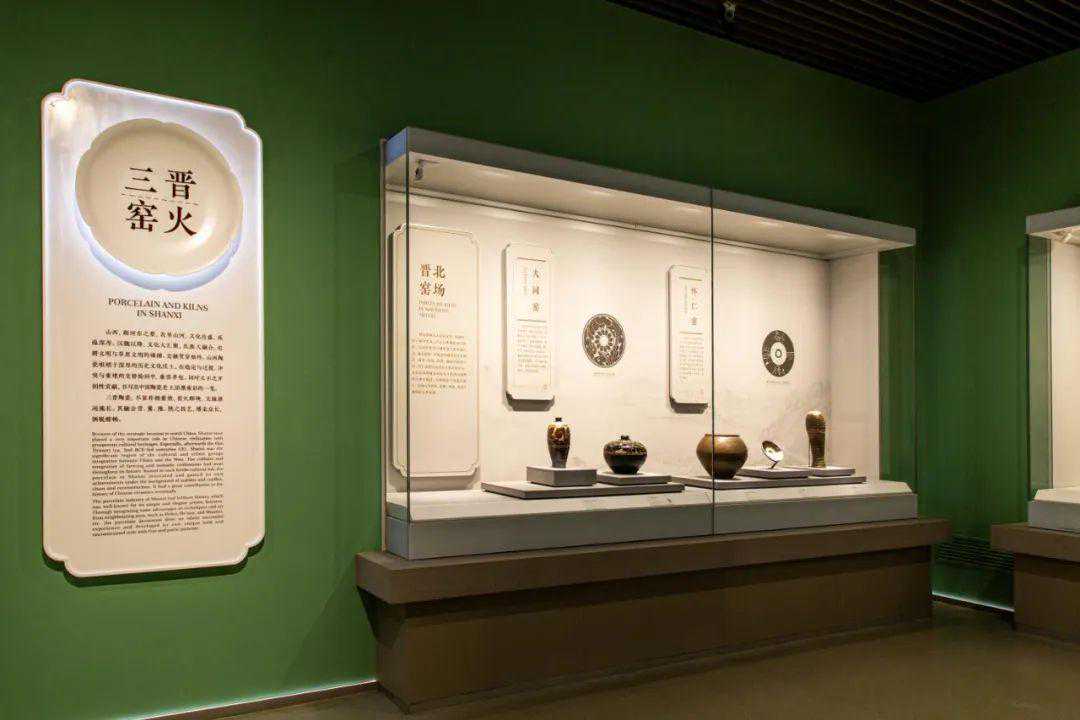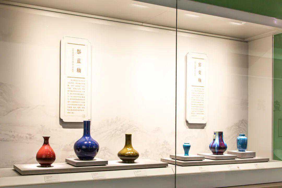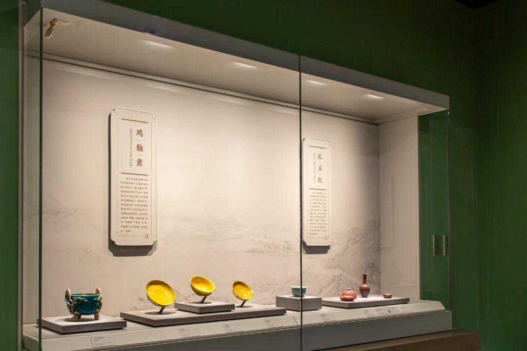 2.展柜之间的呼应主要有:北方邢窑、定窑白瓷展柜和南方建窑、吉州窑黑瓷展柜遥相呼应;河津窑印花白瓷和霍州窑印花白瓷形成呼应;鸡油黄、豇豆红、天蓝釉展柜和祭红、祭蓝、茶叶末釉展柜相呼应。