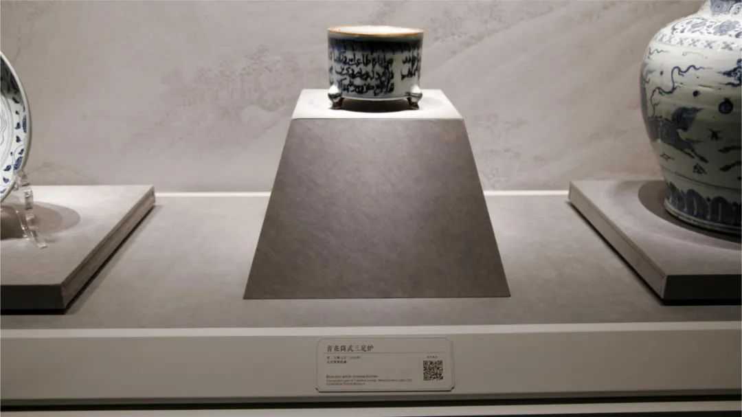 此外,值得一提的还有“明天顺七年青花筒式三足炉”,目前国内馆藏品中,带有天顺年款的青花三足炉仅在故宫博物院和山西博物院有收藏,且都只有一件。外壁皆用青花书波斯文,诗文节选自波斯诗人萨迪的诗集《果园》。故宫博物院藏天顺炉外壁青花波斯文发色稳定,内底用青花书“天顺年”,但三个兽蹄足均有残缺。山西博物院藏天顺炉外壁青花波斯文则晕散严重,内底用青花书“天顺七年大同马”,内壁用青花书“大同马氏书”,三个兽蹄足均保存完好。为山西大同马氏在景德镇的订烧瓷。天顺炉波斯文译文中有:“身在宽广的球场就应把马球猛击……谦逊的智者宛如果树一棵,挂果越多枝头越加弯曲。”至今仍为劝世良言。