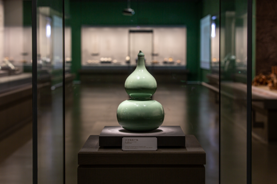 3.独立柜之间的呼应主要有:元青花独立展柜(青花瓷天花板级别展品)和乾隆豆青釉葫芦瓶(单色釉瓷器顶级展品)遥相呼应。第一个独立柜的汉代青釉双系壶到最后一个独立柜的乾隆豆青釉葫芦瓶,两件瓷器朝夕守望,讲述着青瓷跨越数千年的发展历程。站在一侧望向对面,时空仿佛穿越,一眼就是千年。