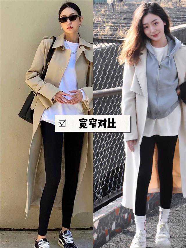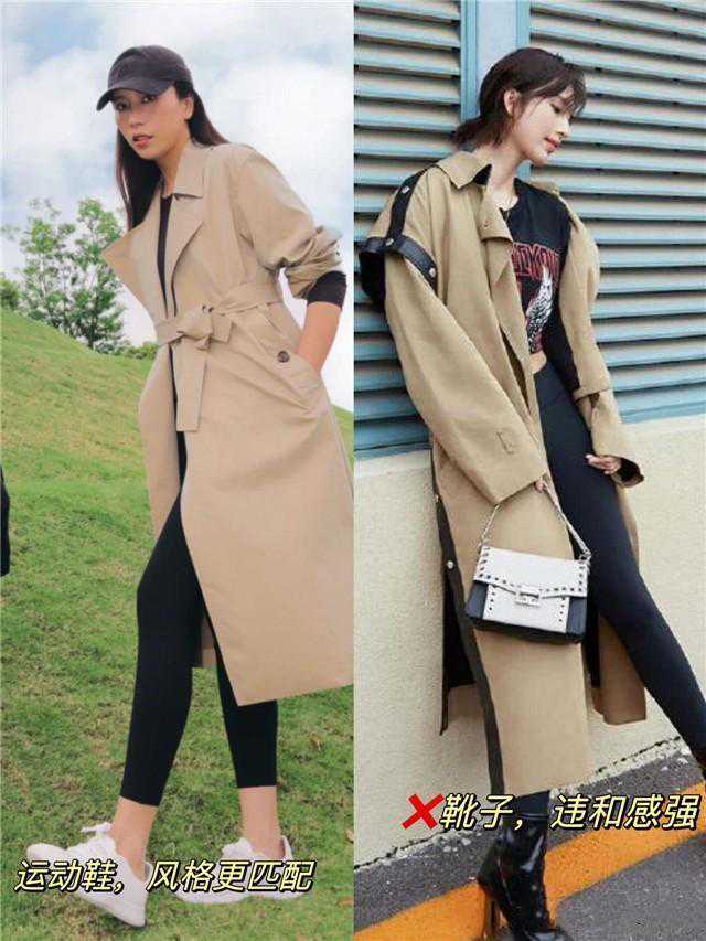 在选择风衣和鲨鱼裤子进行搭配时,应首先注意到版型之间的呼应。一个宽松且长度适中的直筒风衣能很好地遮盖身体上半部分的线条,而当其与修身的鲨鱼裤相搭配后,便可形成明显的松紧对比,上宽下窄的搭配不仅可以拉长下半身的线条,还可以强化整体的视觉收缩效果。